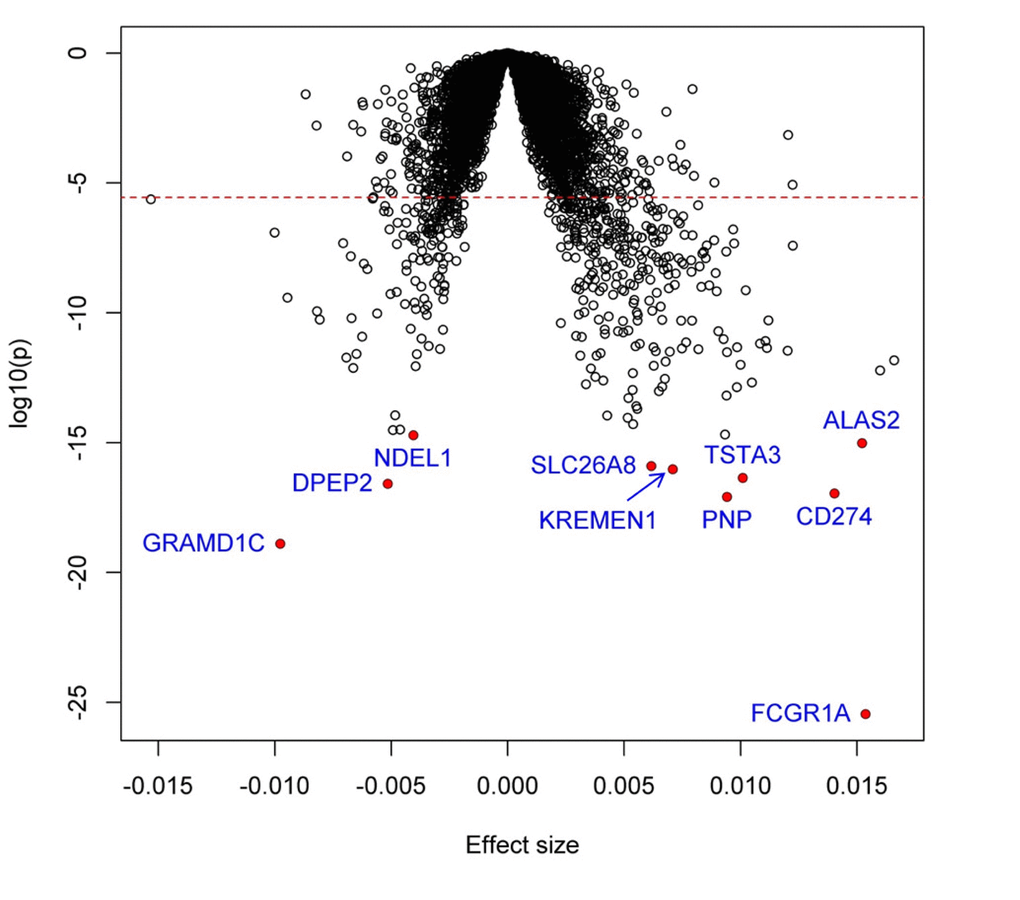 We identified 448 genes significantly associated with the difference (∆Age) between biologic age and chronologic age (P<2.8x10-6). Among them, 302 genes were positively associated with inflammatory ∆age, whereas the remaining 146 genes were negatively associated (Supplemental Table 1). Figure 1 shows the volcano plot of all studied genes, and the top 25 associations are shown in Table 2. The most significant gene was FCGR1A (P=3.5x10-26), which encodes a fragment of Immunoglobulin G, known to play an important role in immune processes.