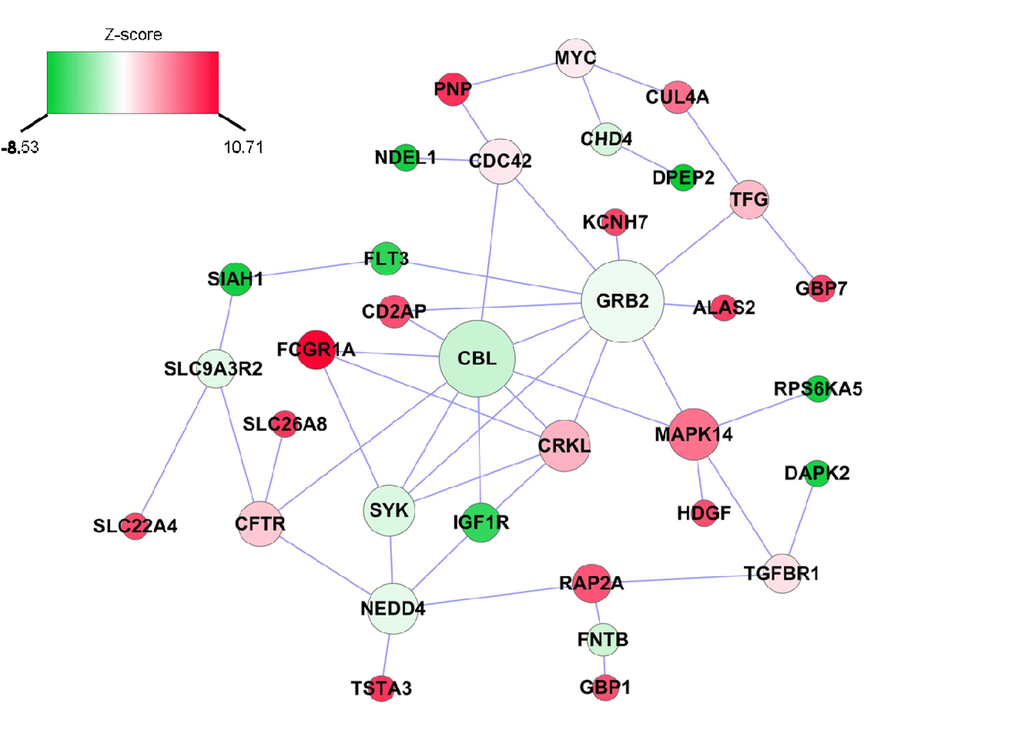 We also applied a dense module searching strategy [14] to identify a subnetwork containing genes associated with inflammatory ∆age. As shown in Figure 2, the subnetwork is comprised of 34 nodes and 47 edges, in which each node represents one gene, and each edge represents the interaction between two genes. Two genes, GRB2 and CBL, play a pivotal role in the network. GRB2 itself was not associated with inflammatory ∆age (P=0.55), but it was connected with 10 other genes, of which five (KCNH7, ALAS2, FLT3, CD2AP, MAPK14) were associated with inflammatory ∆age. Similarly, CBL was not associated with inflammatory ∆age (P=0.07), but four (FCGR1A, IGF1R, CD2AP, MAPK14), out of its seven neighbors were associated with inflammatory ∆age.