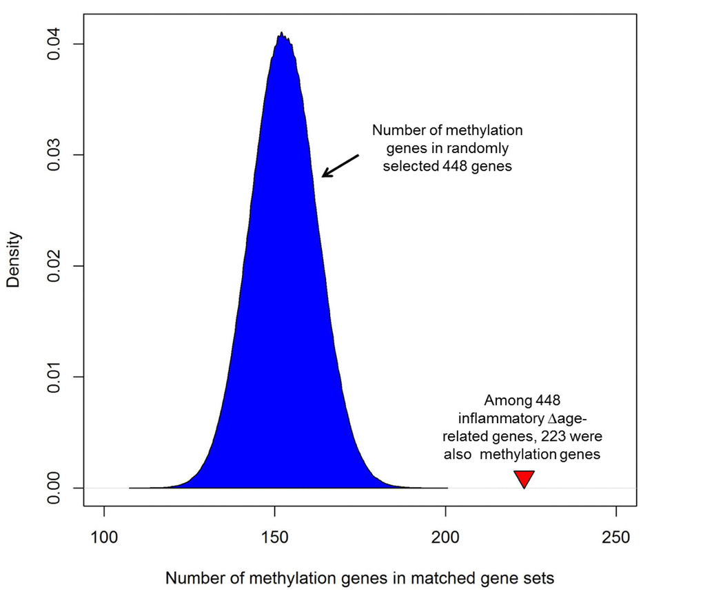 Among 448 genes whose expression was associated with inflammatory ∆age, 223 genes contained at least one CpG site in which methylation was associated with inflammatory ∆age (defined as differentially methylated genes [DMGs], Supplemental Table 1). Among the 223 DMGs, 147 were positively associated with inflammatory ∆age, and the remaining 76 genes were negatively associated with inflammatory ∆age. These gene loci showed two complementary assays demonstrating altered genomic regulation in relation to inflammatory ∆age. In order to assess whether this is greater than chance, we generated one million gene sets, containing 448 randomly selected genes. We then checked how many of the 448 randomly selected genes were DMGs. As shown in Figure 3, on average, each randomly matched gene set contained 153 DMGs (min: 109 genes, max: 199 genes), which is much smaller than that of inflammatory ∆age-related genes (empirical p-value <1x10-6), indicating that there was significant overlap between genes whose expression and whose methylation were associated with inflammatory ∆age. In addition, of the 56 genes associated with inflammatory ∆age that were previously reported to be associated with age [11], 35 genes were DMGs (Supplemental Table 1).