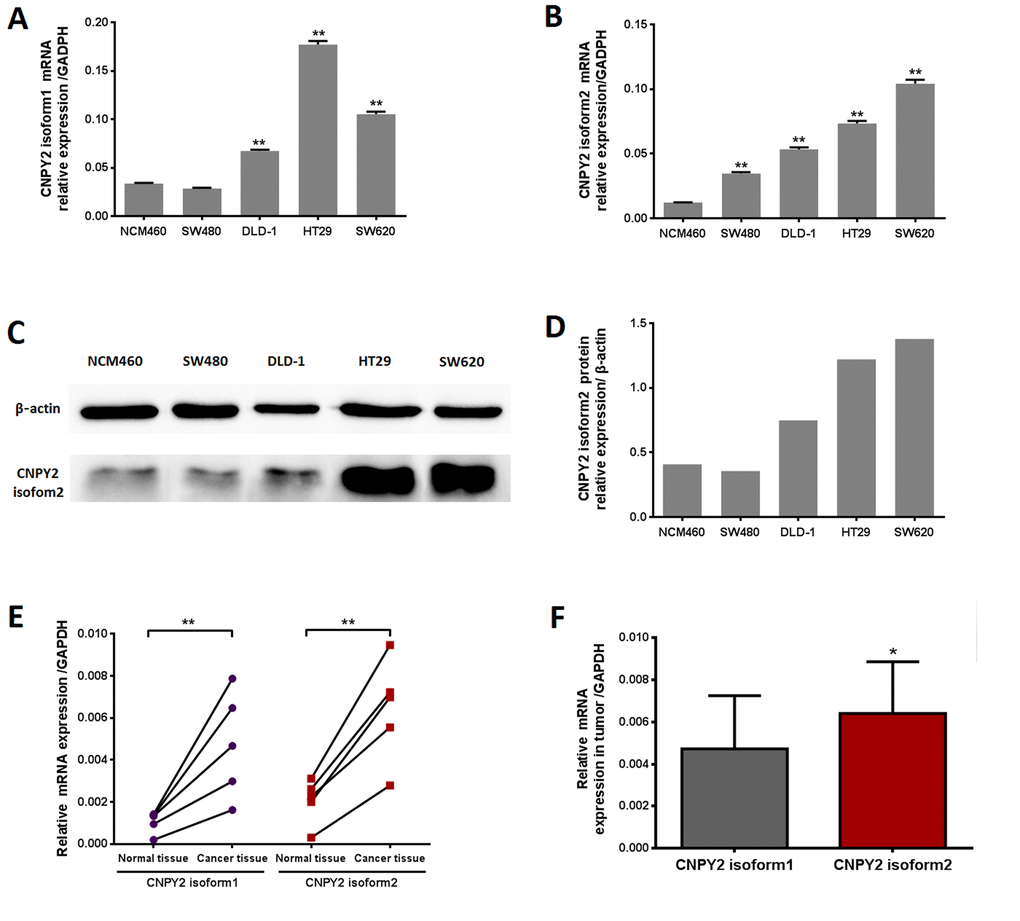 CNPY2 isoform1 and isoform2 mRNA was detectable in normal colonic epithelial cells (NCM460) and CRC cells, including SW480, DLD-1, SW620 and HT29, by quantitative real-time polymerase chain reaction (qPCR) analysis. CNPY2 isoform1 was increased in DLD-1, SW620 and HT29 cells, but not in SW480 cells, compared to that in NCM460 cells (Figure 1A, P < 0.01). Meanwhile, expression of CNPY2 isoform2 was significantly higher in all CRC cell lines compared to the NCM460 line (Figure 1B, P < 0.01). We selected clone 2 of the CNPY2 isoform2 antibody for protein detection as it was the best one for immunohistochemistry (IHC) (Supplemental Figure 3). We found that CNPY2 isoform2 protein was highly expressed in the CRC cell lines DLD-1, HT29 and SW620 but was weakly expressed in SW480 and NCM460 cells by western blot (Figure 1C and 1D). In addition, we found that the two isoforms of CNPY2 mRNA were significantly increased in 5 CRC tissues compared with the paired tumor-adjacent normal tissues (Figure 1E, P < 0.01). Moreover, the expression of CNPY2 isoform2 in CRC tissues was also significantly higher than that of CNPY2 isoform1 (Figure 1F, P < 0.05).