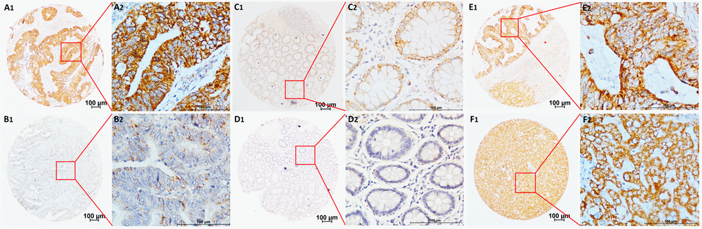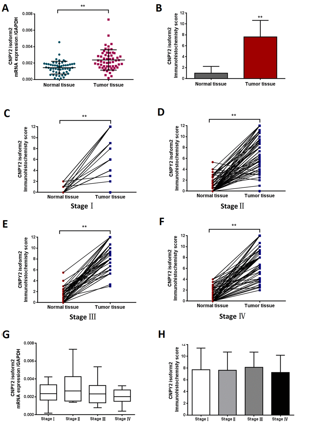 The CNPY2 isoform2 mRNA levels in the series of 57 tumor tissues and tumor-adjacent normal tissues were further examined in this study. Similar to the results shown in Figure 1E, CNPY2 isoform2 mRNA level was significantly elevated in CRC tumor tissues compared to that in tumor-adjacent normal tissues by qPCR analysis (Figure 2A, P < 0.01). In the cohort of 285 patients, the mean IHC score of CNPY2 isoform2 protein expression was substantially higher in tumor tissues than that in tumor-adjacent normal tissues (7.6 ± 0.2 vs. 1.0 ± 0.1, P < 0.001, Figure 2B). Moreover, increased expression of CNPY2 isoform2 in tumor tissues was observed in all patients with stage I-IV disease compared to that of tumor-adjacent normal tissues (P < 0.001, Figure 2C-F), while the expression levels in tumor tissues were comparable among various stages at both the mRNA and protein level (Figure 2G and H). As shown in Figure 3, expression of CNPY2 isoform2 was observed in primary tumors, liver metastatic tumors, tumor-adjacent normal tissues and normal liver tissues. In addition, positive staining of CNPY2 isoform2 protein was predominantly enriched in the cytoplasm of epithelial cells (Figure 3), while some protein was detected in the extracellular matrix (Figure 3A2).