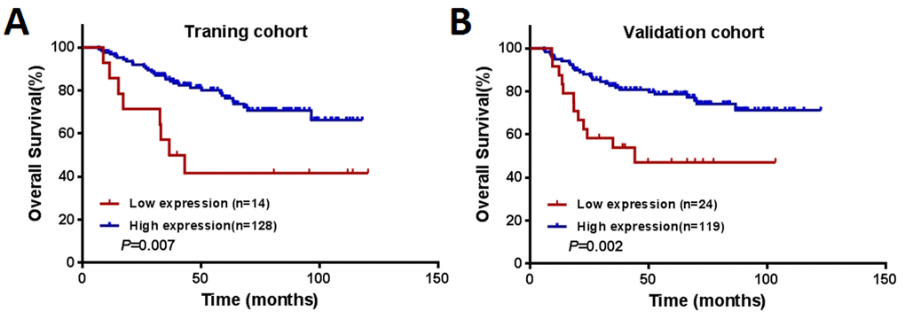 The 285 cases were randomly divided into a training cohort (n = 142) and an independent validation cohort (n = 143). We selected the optimal cutoff CNPY2 isoform2 score as 3.7 at the highest chi-square value of 7.337 in the training cohort (Figure 4). Patients were further divided into 2 groups: 247 (86.7%) patients in the high CNPY2 isoform2 expression group (IHC score ≥ 3.7) and 38 (13.3%) patients in the low CNPY2 isoform2 expression group (IHC score < 3.7). The associations between CNPY2 isoform2 expression and clinicopathological parameters, including gender, age, tumor location, tumor size, histological type, clinical stage, preoperative serum carcinoembryonic antigen (CEA) and CA199, were assessed. No significant association was found between CNPY2 isoform2 expression with all the above clinicopathological characteristics in total cohorts, the training cohort and the validation cohort (Table 1).