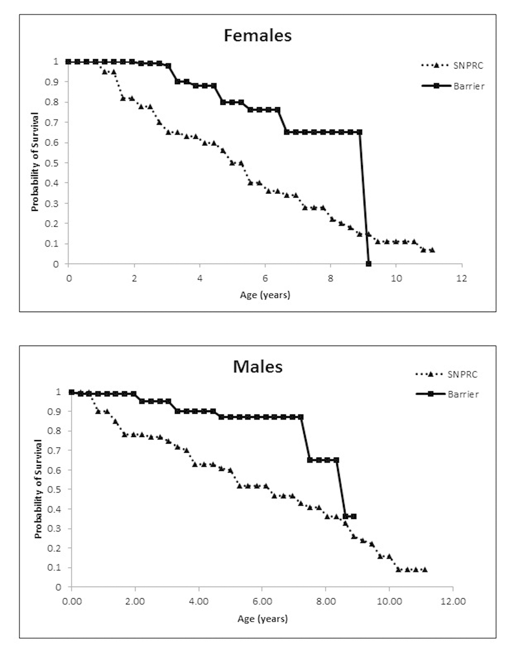 Maintaining marmosets in barrier conditions significantly increased the survival of animals, and adult survivorship plateaued in both males and females when compared to marmosets maintained in conventional housing protocols at SNPRC (Figure 1). We compared survival in a population of 247 barrier animals (115 females and 132 males) versus a population of 370 conventionally housed animals (173 females and 197 males) over a 10-year period. Barrier females had a median lifespan of 8.9 y (95% CI 5.9+ y, upper confidence limit could not be determined due to censoring) compared to a median lifespan of 4.86 y (95% CI 4.06 to 6.38 y) at the primate center with a hazard ratio relative to barrier females of 2.8 (p = 0.001). The female barrier survivorship curve displays a predicted precipitous decline at 9 y which we believe was due to the fact that the longest lived females died, while many middle-aged females were still alive and censored. We remain confident that a difference between the colonies exists based on the Cox proportional hazard analysis and the differences in the median lifespan and their confidence limits. Further, barrier males had a median lifespan of 8.64 y (95% CI 7.6+ y, upper limit could not be determined due to censoring) compared to the 5.08 y (95% CI 4.33 to 7.61 y) at SNPRC with a hazard ratio relative to barrier of 3.44 (p =0.001). Because the populations were tracked for no more than 10 years, there is not a valid lifespan comparison of the SPF colony data with that from the CLEA colony in Japan (Nishijima et al.,2012). However, the early to mid-adulthood survival percentages suggest that the barrier and CLEA populations are similar (Table 3).