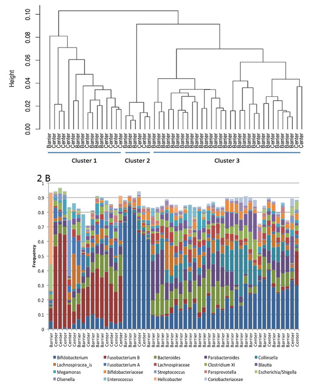 The frequencies of Bifidobacterium and Fusobacterium B (a group that is mischaracterized as Clostridium XIX) largely determined membership within a given cluster, and they were negatively correlated with each other (Figure 2). Thus, communities in Cluster 1, which was the predominant type in the SNPRC colony, had comparatively high frequencies of Fusobacterium B (>6%, median=27%) and low frequencies of Bifidobacterium (<8%, median=4%). In contrast, communities in Cluster 3, which was predominant in the barrier colony, had higher frequencies of Bifidobacterium (median=17%) and lower frequencies of Fusobacterium B (median=1%) with only a single exception, which had high frequencies of both. Communities of Cluster 2 had the highest frequencies of Bifidobacterium, >50% (median=70%) and the lowest frequencies of Fusobacterium B (median=0.0%). Animals with these communities were infrequent in both colonies.