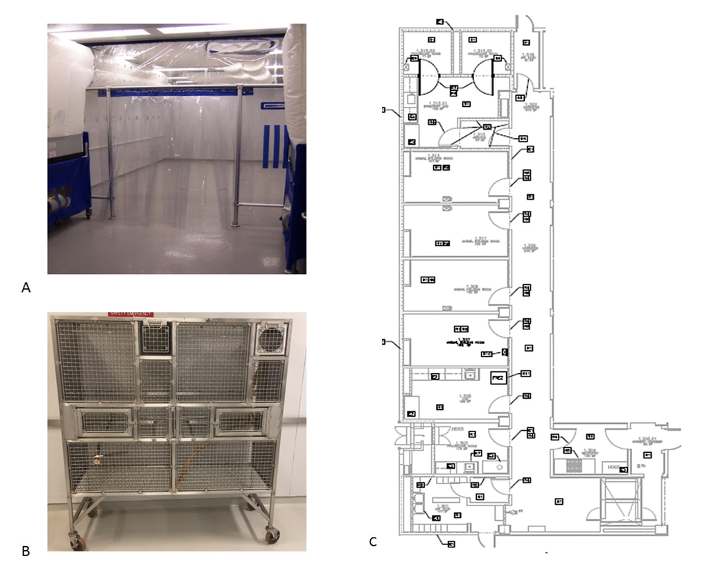 The first barrier rooms of the colony were two 10’x 29’ rooms within the animal care facility at the Barshop Institute located at the UT Health San Antonio Texas Research Park. Rooms were equipped with bioBubble units (Fort Collins CO, www.biobubble.com) consisting of two HEPA filtered airshower power units providing 200-300 air changes per hour in the 10’ x 18’ animal vivarium space (Figure 3A). The front entry of the room contained clean PPE storage for entry into the screened vivarium. Each room maintained a positive air pressure to the outside hall. All items within the bioBubble and entering the bioBubble area were considered clean and rigorous SOP’s to ensure cleanliness were used. The vivarium housed six family units consisting of at most two adults, four independent offspring and two-three dependent offspring in marmoset breeding cages measuring (1.3 x 1.5 x 0.6m) made of stainless steel specifically designed for this colony (LGL) (Figure 3B). All items entering the barrier were sanitized prior to entry or autoclaved. Water bottles were autoclaved before use, and all water used in the room was autoclaved. The paper placed under the cage to capture waste was DACB neomycin coated cage liner (Shepherd Specialty Paper, Watertown, TN) to decrease the potential for aerosolized urinary product and contamination between cages. Personal protective equipment for the facility included standard shoe covers, hair bonnet, face mask and gloves as well as a disposable outer gown. Staff were required to enter the barrier rooms prior to work with any other animals or entry into other animal facilities. Clean scrubs were required to enter the barrier spaces, and if a staff member had already entered another animal room they were required to shower before entering the marmoset barrier.