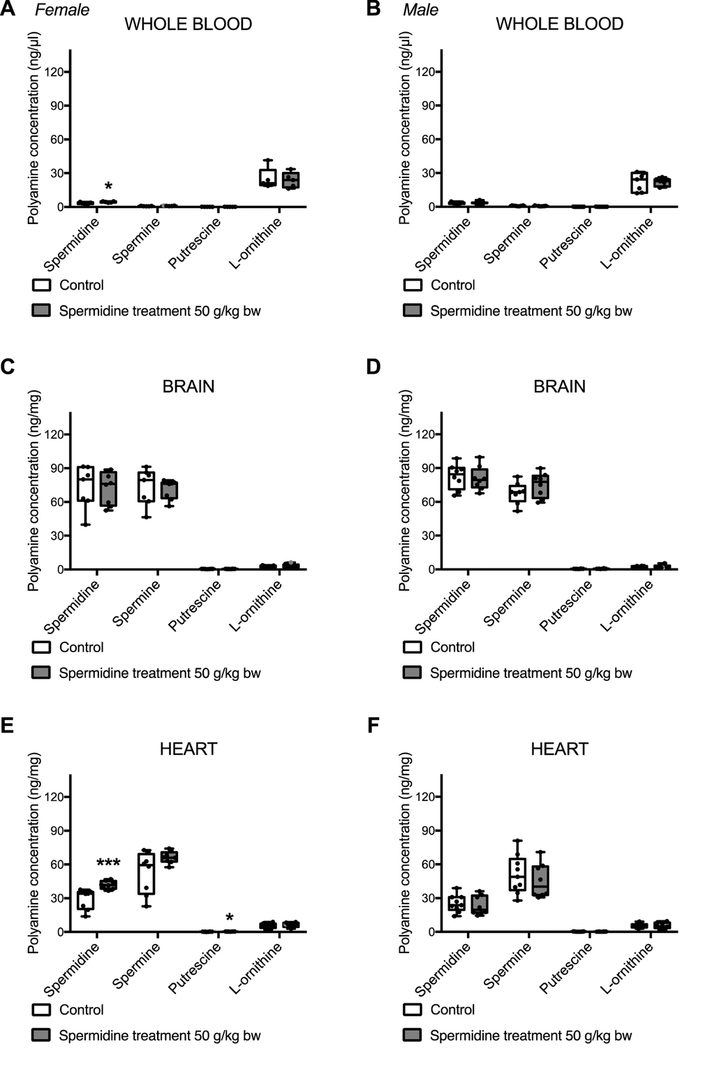 Analysis of polyamine levels showed no significant differences in accumulation of polyamines in several tissues after the oral spermidine supplementation in both sexes with few exceptions (Figure 1). While spermidine levels in whole blood of female mice supplemented with highest concentration of spermidine-rich extract in chow was significantly increased compared to the control group after 4 weeks, spermidine blood level in female mice at lower extract concentrations and all male mice remained unaffected by the treatment. Levels of other polyamines in the whole blood remained comparable to the control group in both sexes. Cardiac increase in spermidine and putrescine concentrations after the treatment was observed only in female mice with 50 g/kg bodyweight supplementation, but not at lower concentrations in female or at any supplement concentration in male mice. Concentration of various polyamines in brain tissue showed no correlation to provided treatment. L-Ornithine concentration was not changed in any examined tissues.