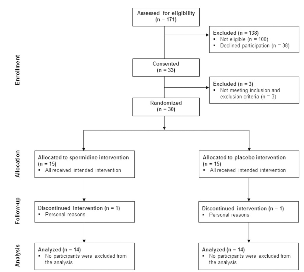 One-hundred-seventy-one adults were interviewed by telephone for study eligibility based on inclusion and exclusion criteria (Figure 2). One-hundred-thirty-eight subjects were excluded, because they were not eligible (n = 100) or declined participation (n = 38). In total, 33 participants were invited from January 2016 to March 2016 for on-site screening. Here, three more individuals had to be excluded because they did not meet inclusion and exclusion criteria. Thirty participants (target sample size of the trial, see clinicaltrials.gov NCT ID: NCT02755246) completed baseline assessment, were subsequently randomized to either spermidine or placebo intervention, and started with the 3-month intervention. During this time, two participants (spermidine group: n = 1; placebo group: n = 1) dropped out due to missing motivation. Twenty-eight participants completed the intervention and were included in the present analysis.