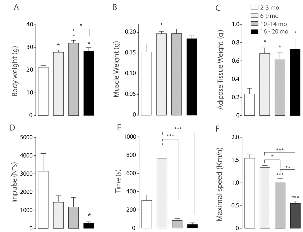 Altogether, these physical characteristics show that there are changes in muscle function that occur previous to an old stage of lifespan in mice, and that can be presented as mild sarcopenia symptoms (muscle and weight loss) as characterized in human.