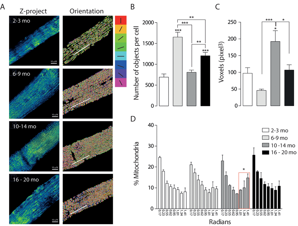 We also described that both the distribution and orientation of mitochondria changed with age, the most prominent change occurring at 10-14 month old when there is redistribution towards a more striated pattern, perpendicular to the longitudinal axis of the fiber. After this period, more longitudinal mitochondria can be found: these results concur with those in fibers from aged mice where, striations are not as well preserved as in adult fibers, with some mitochondria forming longitudinal columns between myofibrils [42].