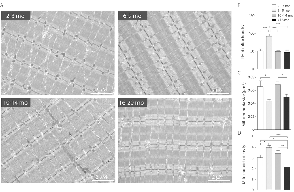 To further study the changes in mitochondrial spatial distribution and the status of development of the muscle fiber, electron microscopy for longitudinal slices of FDB muscle was performed (Fig. 3). Our results show that the number of mitochondria significantly decreased in the adult group as the area of mitochondria increased, supporting what we observed in isolated fibers by confocal microscopy (Fig. 3B). Moreover, the area of the mitochondria observed at 6-9 months was significantly decreased suggesting a fragmented phenotype (Fig. 3C). Together with these findings, the mitochondrial density, considered as the area of mitochondria per area of muscle fiber, was significantly increased in the Young group when compared to the Juvenile; this is maintained in the Adult group and then significantly decreases in the older group (Fig. 3D). To verify our results, we observed SSM in different ages and quantified number of mitochondria and area by TEM. The number of mitochondria was significantly increased in the subsarcolemma region in the 6-9 months old group, comparable with our observations in the IMF (Supplementary Fig. 2); the changes in this parameter were consistent in both subpopulations of mitochondria in the four age groups. The size of both subsarcolemmal and intermiofibrillar subpopulations of mitochondria mostly correlate with what we found in confocal microscopy, in both we can find an increase in the number of mitochondria for the 6-9 mo group and a subsequent decrease in the older groups, while mitochondria size variations differ in the SS subpopulation, but despite the differences in apparent size, both subpopulations show changes during the aging process that can be clearly differentiated in the four stages.