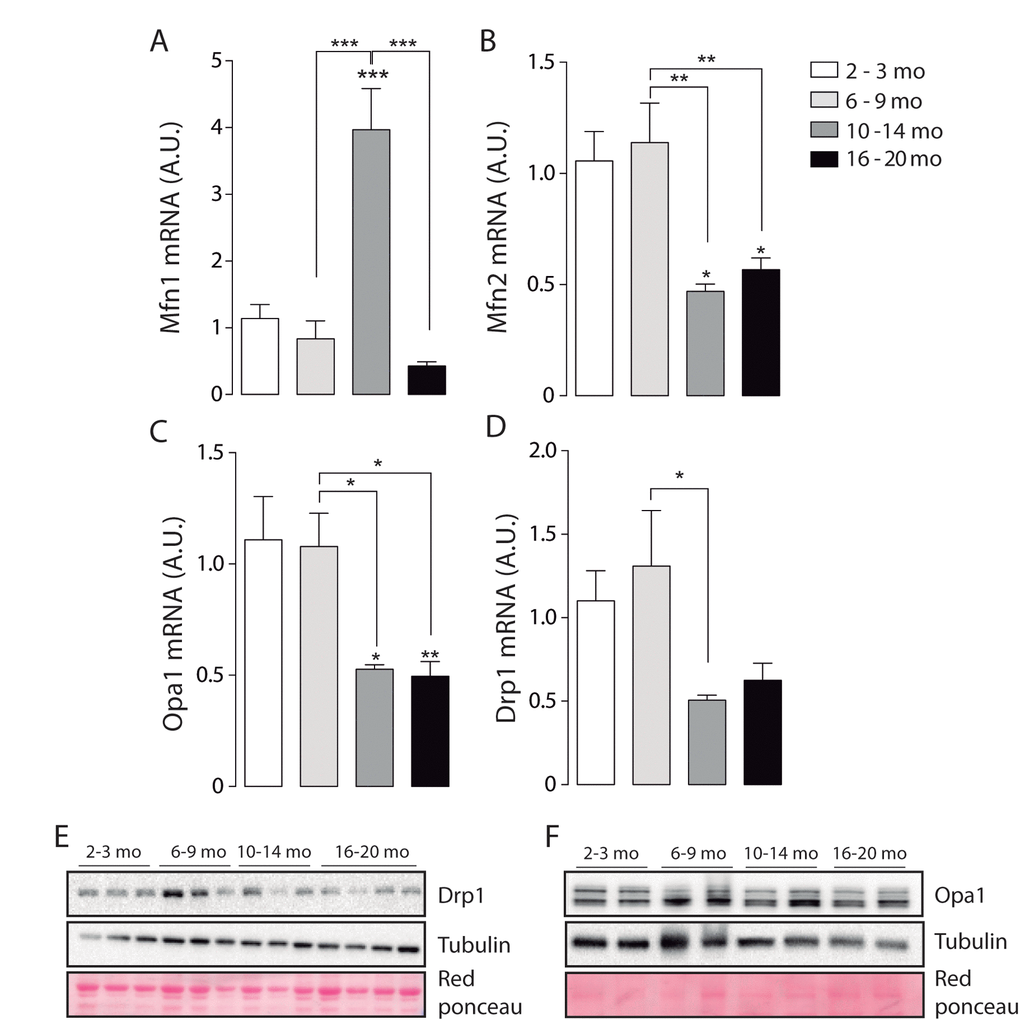 These results show that mitochondrial fusion-fission mRNA and protein levels differentially vary during the aging process, reaching significantly lower levels of mitochondrial dynamics proteins in older animals.