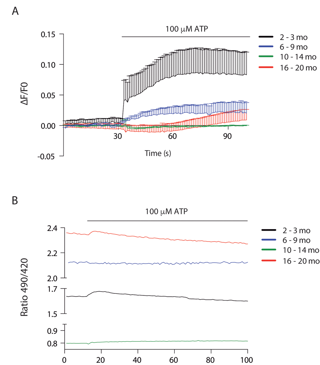 To address Ca2+ handling we measured cytosolic signals in isolated muscle fibers of each group after ATP stimulus, we found that a cytosolic signal was obtained only in juvenile mice, which was significantly decreased in the 6-9 mo group. This signal was completely lost in the 2 older groups (Fig. 6A).