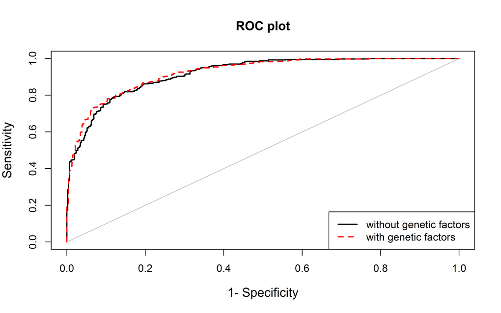 Analyses have been performed using pROC, and SNPassoc packages of R (http://www.R-project.org/). The difference between AUC values was tested using the method proposed by DeLong [54].