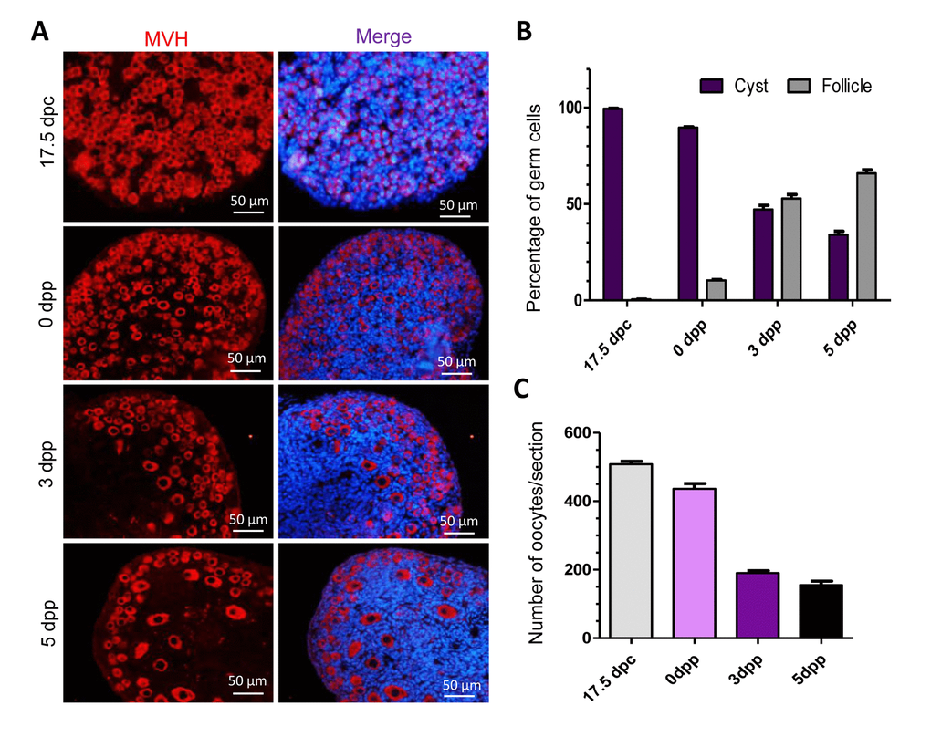 Previous studies have demonstrated the important time frames of germ cell loss in mice. In this investigation, we investigated the dynamics of mouse germ cells in cysts and follicles at 17.5 dpc, 0 dpp, 3 dpp and 5 dpp. The germ cells were labeled with the germ cell specific mouse Vasa homolog (MVH) in cysts and follicles and were counted (Fig. 1A). In 17.5 dpc mouse ovaries, almost all the germ cells were held in germ cell cysts, in 0 dpp ovaries about 10% of the germ cells were within follicles, while in 3 dpp and 5 dpp ovaries about 50% and 70% of the germ cells were in follicles (Fig. 1B). In general, the breakdown of germ cell cysts and primordial follicle formation occur during the period of perinatal. We also counted the average number of total germ cells at these four-time points and found that remarkable germ cell loss happened during this period, especially at 3 dpp, showing a more than 50% reduction in germ cell numbers compared to 0 dpp ovaries (Fig. 1C).