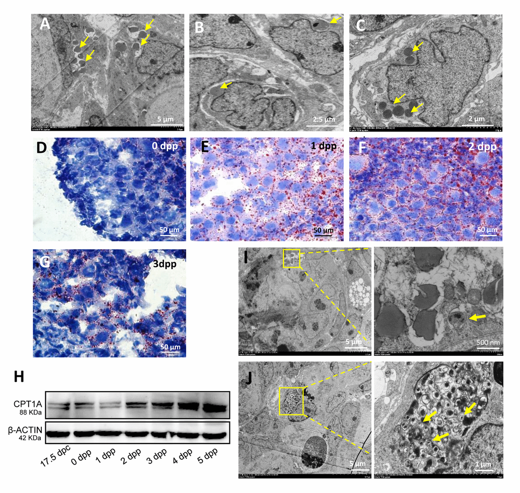 TEM was used to detect the 1 dpp and 2 dpp mouse ovaries, and it was found that during this period of intense germ cell loss a large number of germ cells within the cysts showed the phenomenon of nuclear lipidation (Fig. 2A - 2C). These dying germ cell nuclei were broken into fragments and formed lipid droplets. Oil red O staining confirmed that a high level of lipid droplets in 1 dpp and 2 dpp ovaries (Fig. 2D - 2G). We also detected that the regulator of fatty acid oxidation, carnitine palmitoyltransferase 1A (CPT1A), was highly expressed in the 17.5 dpc to 4 dpp mouse ovaries (Fig. 2H). Moreover, we found the existence of autophagosomes (Fig. 2I) which were also found in the germ cells undergoing apoptotic cell death (Fig. 2J).