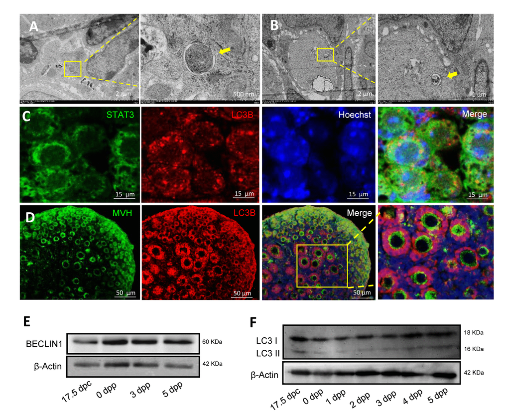 One of the most important transitions is the change from the fetal ovarian environment to neonatal namely the transition from a nutrition supply from the maternal-fetal blood interface to lactation [25]. This transformation results in a limited supply of nutrients and resources which may be an important aspect of oocyte loss in the ovary. Programmed cell death (PCD), especially apoptosis, is reported to be responsible for the loss of oocytes [26–29], which is regulated by the balance of the expression of apoptotic genes, such as Bax and Bcl-2 [30–32]. Autophagy, an important process, is crucial for the degradation of organelles [33–35], and has been reported to function in the development of germ cells [36–44]. A previous study revealed that female Atg7 (autophagy related gene 7) knock-out mice are infertile. And germ cells with mutated Atg7 showed a failure in the formation of autophagosomes which suggested a connection between germ cell development and autophagy [44]. Several reports have proved that autophagy plays a vital role during germ cell loss [36,41,42]. Another report demonstrated that Beclin1 knocked-out mouse ovaries showed about a 50% - 60% reduction in the number of oocytes at 1 dpp. Moreover, the mouse ovaries with mutated Atg7 lacked discernable oocytes and follicles at 1 dpp [36]. Atg7 knockout mouse ovaries showed a great reduction of LC3 expression and displayed a remarkably decreased number of oocytes at 17.5 dpc [41]. All of these reports demonstrated that inhibition of autophagy would cause germ cell loss during the germ cell cyst breakdown period, suggesting autophagy may act as a protection or survival mechanism during germ cell cyst breakdown and the formation of the primordial follicle pool in mammalian ovaries.