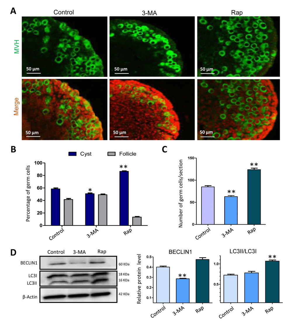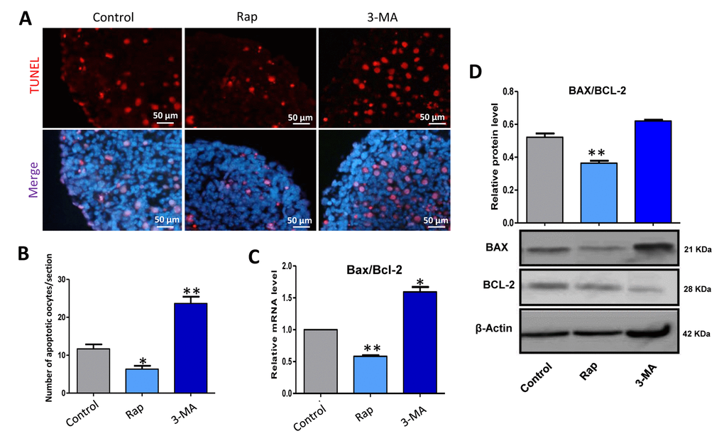 TUNEL assay showed that rapamycin treated ovaries for 3 days showed a lower level of apoptosis compared to that of the control group (Fig. 7A and 7B), which was confirmed with the ratio of Bax/Bcl-2 mRNA and protein (Fig. 7 and 7D). These data indicate that rapamycin induced autophagy to delay germ cell cyst breakdown, and resulted in more oocytes surviving.