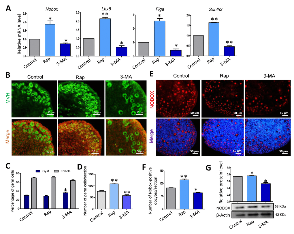 Although there was no trend in the expression of follicle formation relevant genes after 3 days of culture (data not show), rapamycin treated ovaries after 5 days culture showed a much higher level of expression of Nobox, Lhx8, Figlα and Sohlh2, whereas the 3-MA treated group had a decreased expression level of these genes compared to that of the control group (Fig. 6A). We also investigated the status of primordial follicle formation in the three groups (Fig. 6B), and rapamycin treated group displayed a very similar ratio of oocytes in follicles after 5 days culture compared to that of the control group, but with a much larger number of total oocytes surviving, while the 3-MA treated group displayed fewer oocytes surviving (Fig. 6C and 6D). Furthermore, rapamycin treated ovaries for 3 days had a higher number of NOBOX positive cells and higher expression of NOBOX, while the 3-MA treated group showed the opposite result (Fig. 6E - 6G).