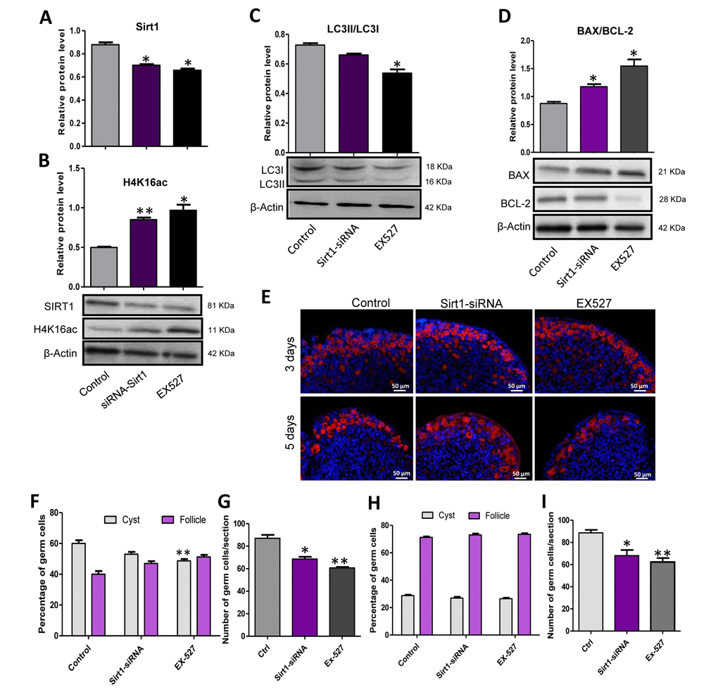 Sirt1 was reported to influence the level of autophagy and to work together with hMOFs in regulating the outcome of autophagy therefore we investigated the role of Sirt1 in autophagy and the formation of primordial follicle. Firstly, 17.5 dpc mouse ovaries were cultured in vitro for two days, then Sirt1 inhibitor, EX527 or Sirt1 RNAi were added into the culture for an additional 3 or 5 days. The ovaries that were treated with EX527 or Sirt1 RNAi showed a decreased level of SIRT1 protein (Fig. 8A) and an increased level of H4K16ac (Fig. 8B) compared to the control group after 2 days of treatment. We also detected the level of autophagy of these three groups and found that the ratio of LC3II/LC3I was decreased in the EX527 or Sirt1 RNAi treated group (Fig. 8C), indicating a depression of autophagy by Sirt1 inhibition. Moreover, EX527 or Sirt1 RNAi decreased the ratio of BAX/BCL-2 (Fig. 8D). We also investigated the status of germ cell loss during the treatment (Fig. 8E) and found that after 3 days of culture, EX527 or Sirt1 RNAi group had enhanced germ cell cyst breakdown and the average number of total germ cells in these two groups was decreased in comparison to the control group (Fig. 8F and 8G). After 5 days treatment, EX527 or Sirt1 RNAi group had a very similar ratio of oocytes in cysts and follicles compared to that of control group, but an obvious reduction in the number of surviving oocytes (Fig. 8H and 8I).