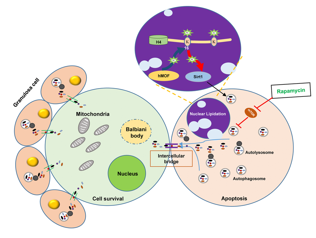 In conclusion, the data in this investigation demonstrate that autophagy plays a part in germ cell cyst breakdown and primordial follicle assembly. Rapamycin promoted autophagy with a delay in germ cell cyst breakdown and an increased number of surviving oocytes, which might be regulated by Sirt1 mediated epigenetic regulation. The transformation of LC3B from oocytes within cysts to granular cells of follicles may be associated with the nutrient transport of surviving oocytes, suggesting autophagy promotes the cyclic utilization of nutrient, so as to depress unnecessary apoptosis, avoiding germ cell over loss during germ cell cyst breakdown and establishment of the primordial follicle pool (Fig. 9).