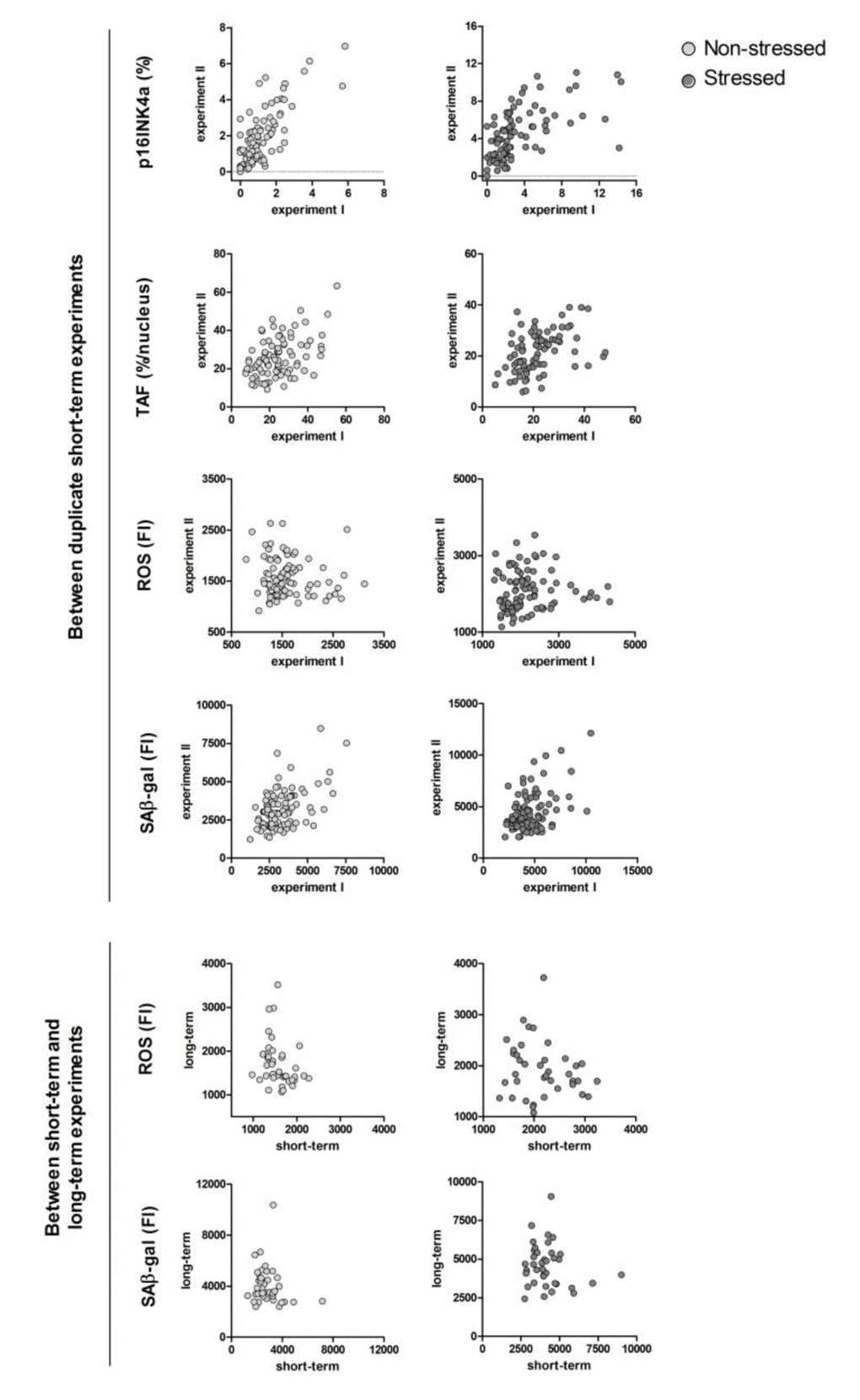 First, we studied correlations between the same markers, both in non-stressed and stressed conditions. The correlation of duplicates of each senescence marker (p16INK4a, telomere associated foci - TAF, reactive oxygen species - ROS and senescence-associated β-gal - SAβ-gal) were tested between experiment I and II of the short term experiments (Table 2). Most markers showed a significant association between experiments I and II (coefficients > 0.400), except for ROS which showed low, non-significant correlation coefficients.