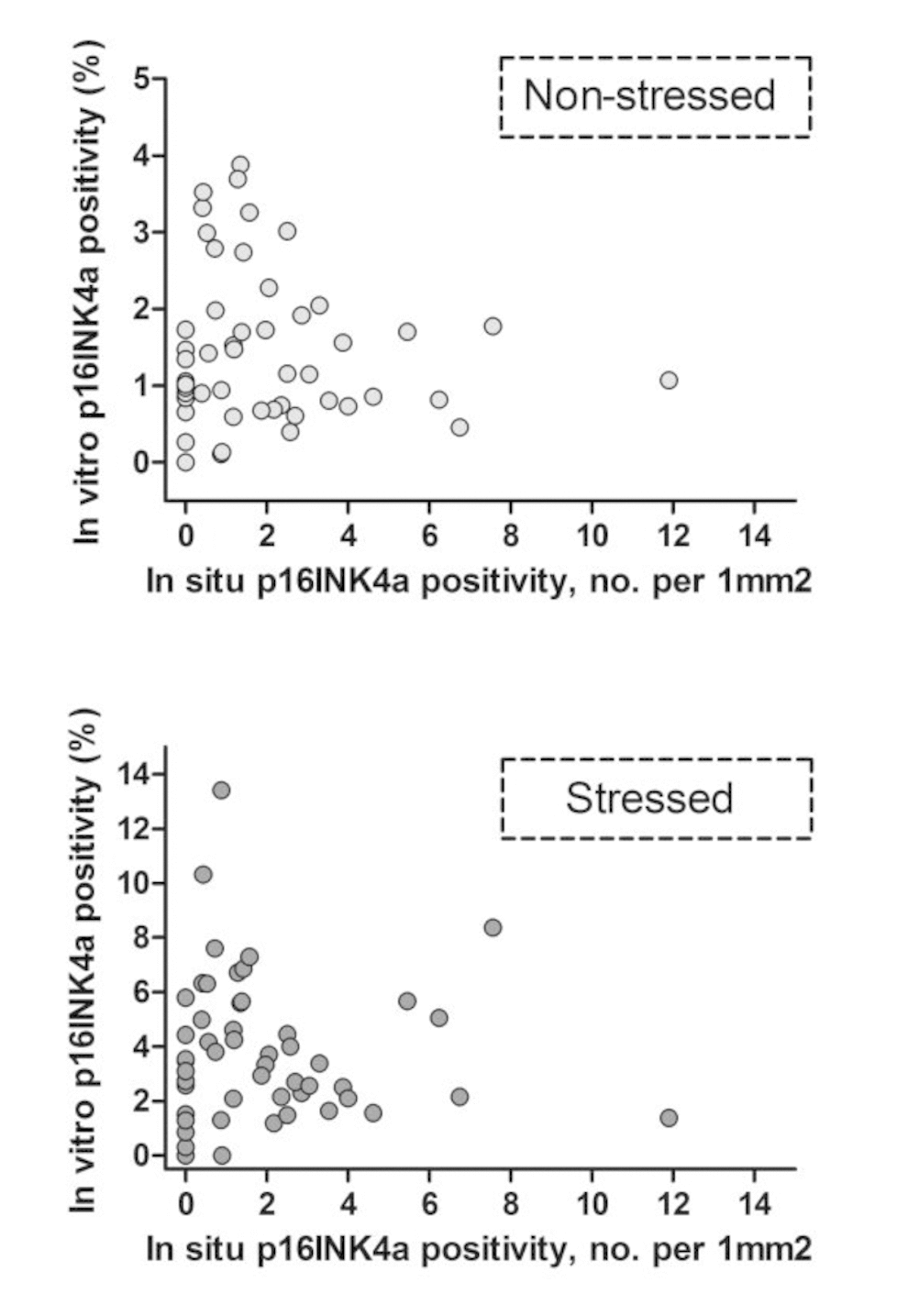 Second, we studied correlations between different senescence markers. In the Supplementary Material, correlations between different senescence markers within the short-term (Supplementary Table 1) and long-term experiments (Supplementary Table 2) are given. In the short-term experiment each marker was tested against the 3 other markers, both in non-stressed (6 combinations) and stressed condition (6 combinations). Of these 12 senescence marker combinations, 6 were significantly correlated (in non-stressed and stressed conditions 3 each). P16INK4a showed the highest correlations with other markers. In the long-term experiment a total of 6 marker combinations were tested in both non-stressed and stressed conditions of which 3 senescence marker combinations were significantly correlated, mainly with ROS (2 in the non-stressed condition, 1 in the stressed condition). Using telomere length instead of telomere shortening reduced the amount of significant markers combination correlations, indicating a difference in telomere length and telomere shortening over time as senescence markers. In vitro senescence markers (both in non-stressed and stressed conditions) were tested for correlation with in situ p16INK4a positivity of dermal fibroblasts (Table 4). No significant correlations were observed between in situ p16INK4a positivity and any of the in vitro senescence markers (ROS, TAF, SAβ-gal or p16INK4a). In Figure 2, in vitro p16INK4a positivity in non-stressed and stressed conditions are plotted against in situ p16INK4a positivity of dermal fibroblasts, further showing this lack of intra-individual correlation.
