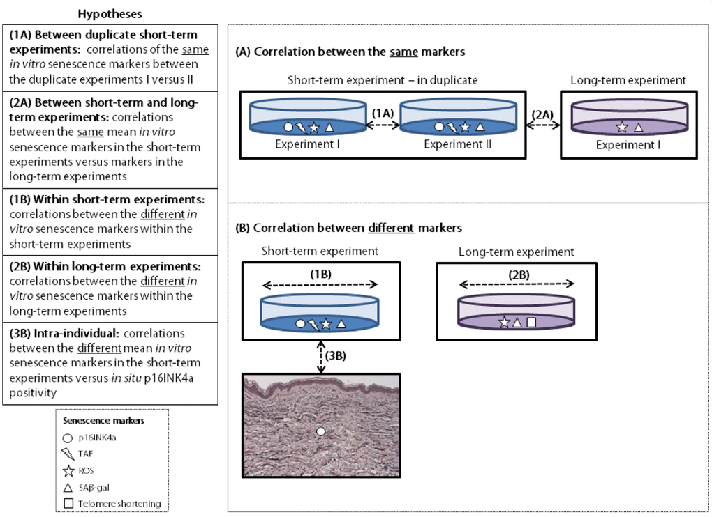 Apart from growth arrest, several other markers of cellular senescence have been studied (reviewed in [10]). A frequently used marker is senescence-associated β- galactosidase (SAβ-gal) activity, which is upregulated in, but not essential for senescence [9,11]. Other markers are based on triggers of senescence such as DNA damage foci or reactive oxygen species (ROS), expression of genes involved in cell cycle arrest or factors that are secreted by senescent cells [3,10,12]. Most of these markers have been established by detecting senescence in vitro, but some can also be used in situ [13]. However, the number of studies on fibroblasts reporting on senescence in situ compared to in vitro is disproportionally small [14], and there is a lack of knowledge concerning the correlation of senescence markers between these conditions. In addition, only a few attempts have been made to study the correlation between different senescence markers. Our aim is to study the correlations between the same senescence markers (A) and between different senescence markers within individual donors (B), using a unique dataset of highly standardized experiments. These experiments included in vitro short-term experiments (1); in vitro long-term experiments (2), and in situ experiments within skin biopsies (3). First we investigated correlations between the same senescence markers: in vitro between duplicate experiments (1A) and in vitro between short-term and long-term experiments (2A). In addition, we investigated correlations between different senescence markers: between in vitro markers within the same short-term experiments (1B); between in vitro markers within the same long-term experiments (2B); and intra-individually between in vitro markers and in situ p16INK4a positivity in skin biopsies (3B).