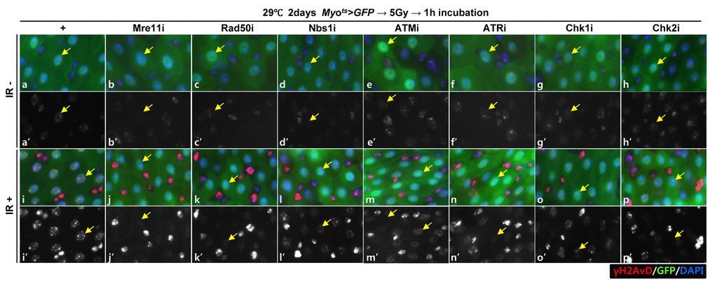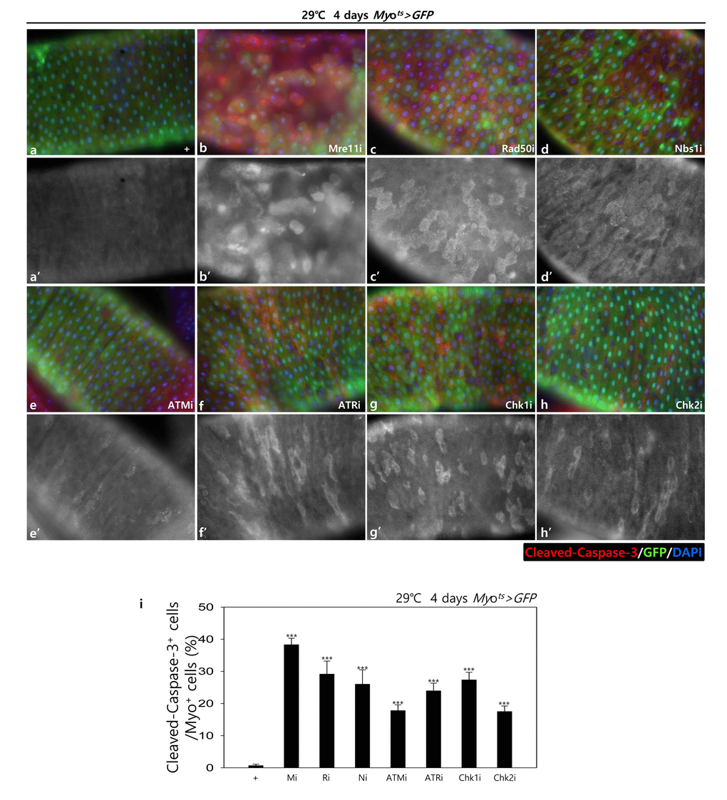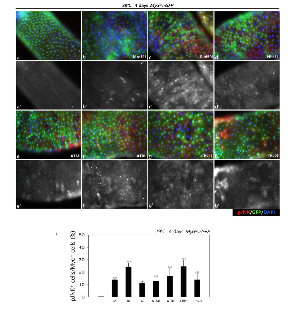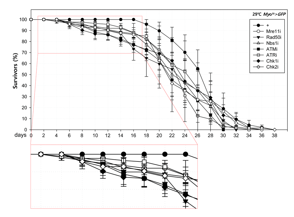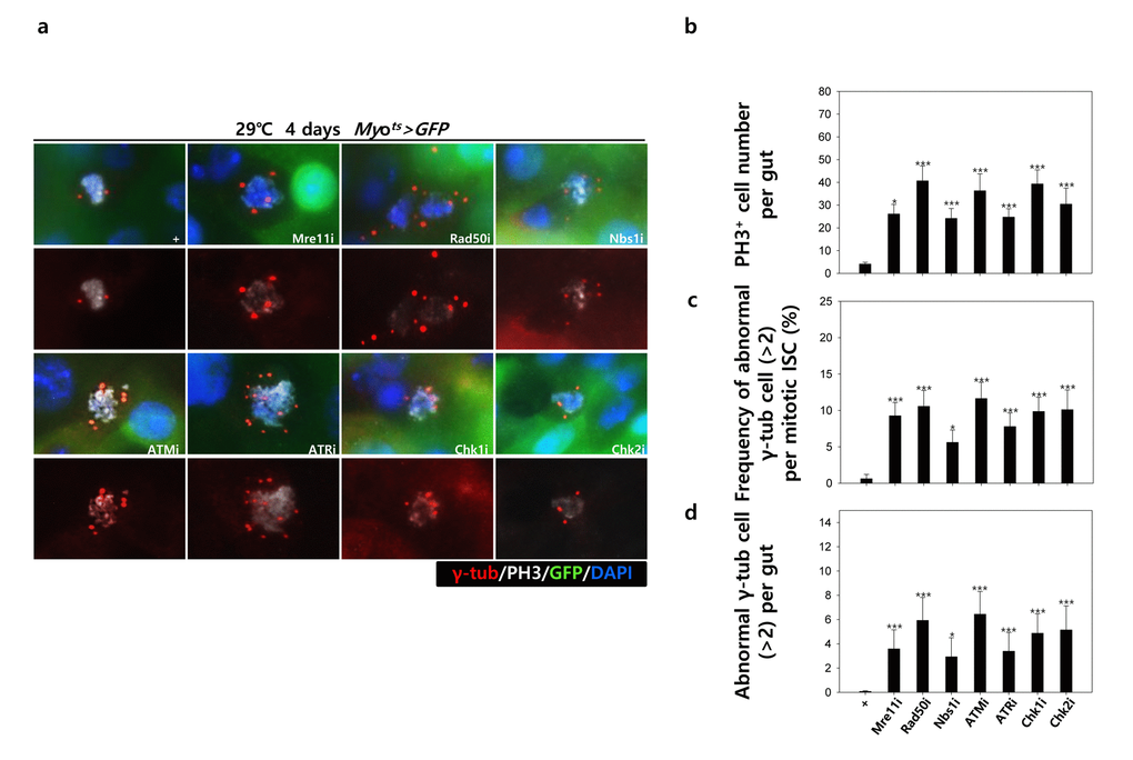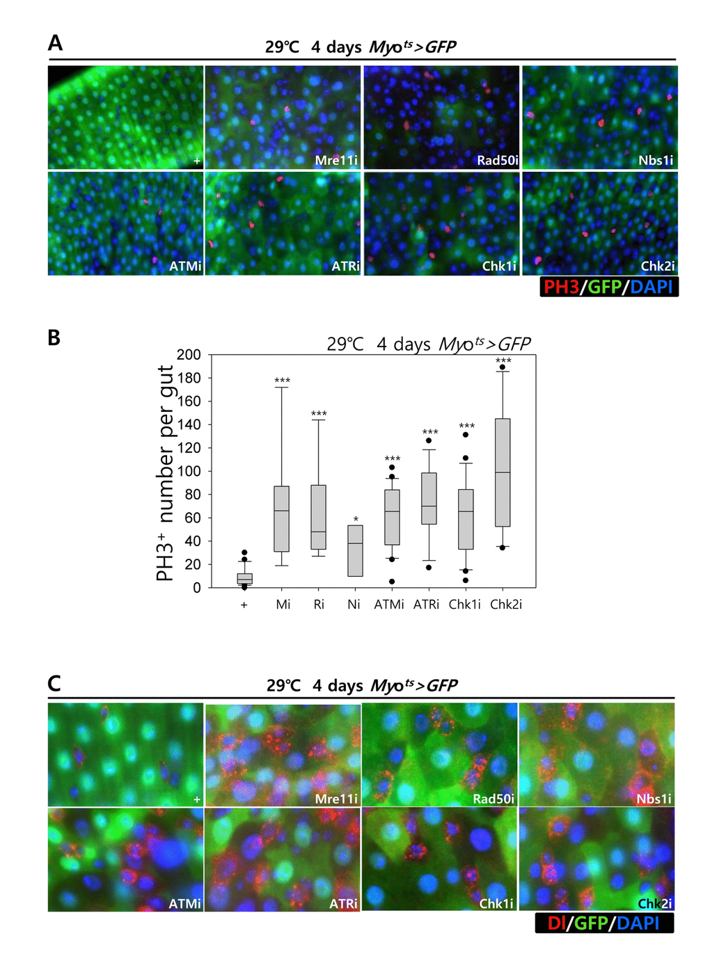 In the present study, we found EC-specific knockdown of DDR-related factors affected differently the level of γH2AvD, cell death, and ISC aging phenotype. It was reported that ATR is more important than ATM on DDR in the ISCs [45]. In proliferating cells as a larval brain, grp (Chk1) mutant does not show severe defects in the DNA repair unlike mei-41 (ART) mutant [65]. Further study needs to be done on which DDR-related factors play a more critical role in EC.