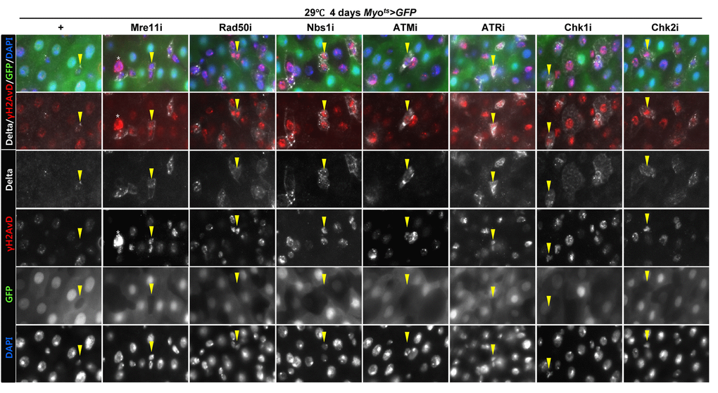 The following primary antibodies diluted in PBST were used in these experiments: mouse anti-Delta, mouse anti-Arm (Developmental Studies Hybridoma Bank, Iowa City, IA, USA), 1:200; mouse anti-GFP and rabbit anti-GFP (Molecular Probes, Eugene, OR, USA), 1:1000; rat anti-GFP (Nacalai Tesque Inc., Kyoto. Japan), 1:1000; rabbit anti-γH2AvD (Rockland, Gilbertsville, PA, USA) 1:2000; rabbit anti-pS/TQ (Cell Signaling Technologies, Danvers, MA, USA), 1:1000; rabbit anti-phospho-histone H3 (PH3, Millipore, Billerica, MA, USA), 1:1000; mouse anti-γ-tubulin (Sigma-Aldrich), 1:1000; rabbit anti-β-gal (Upstate Biotechnology Inc., Lake Placid, NY, USA), 1:1000; and anti-CCleaved caspase-3 (Cell Signaling Technologies), 1:1000; rabbit anti-pJNK antibody (Cell Signaling Technologies). The following secondary antibodies diluted in PBST were used: goat anti-rabbit FITC (Jackson ImmunoResearch, West Grove, PA, USA), 1:400; goat anti-rabbit Cy3 (Jackson ImmunoResearch), 1:400; goat anti-mouse FITC (Jackson ImmunoResearch), 1:400; goat anti-mouse Cy3 (Jackson ImmunoResearch), 1:400; goat anti-rat FITC (Jackson ImmunoResearch), 1:400, goat anti-rabbit Alexa Fluor® 647 (Jackson ImmunoResearch), 4′,6-diamidino-2-phenylindole (DAPI, Molecular Probes), 1:1000.