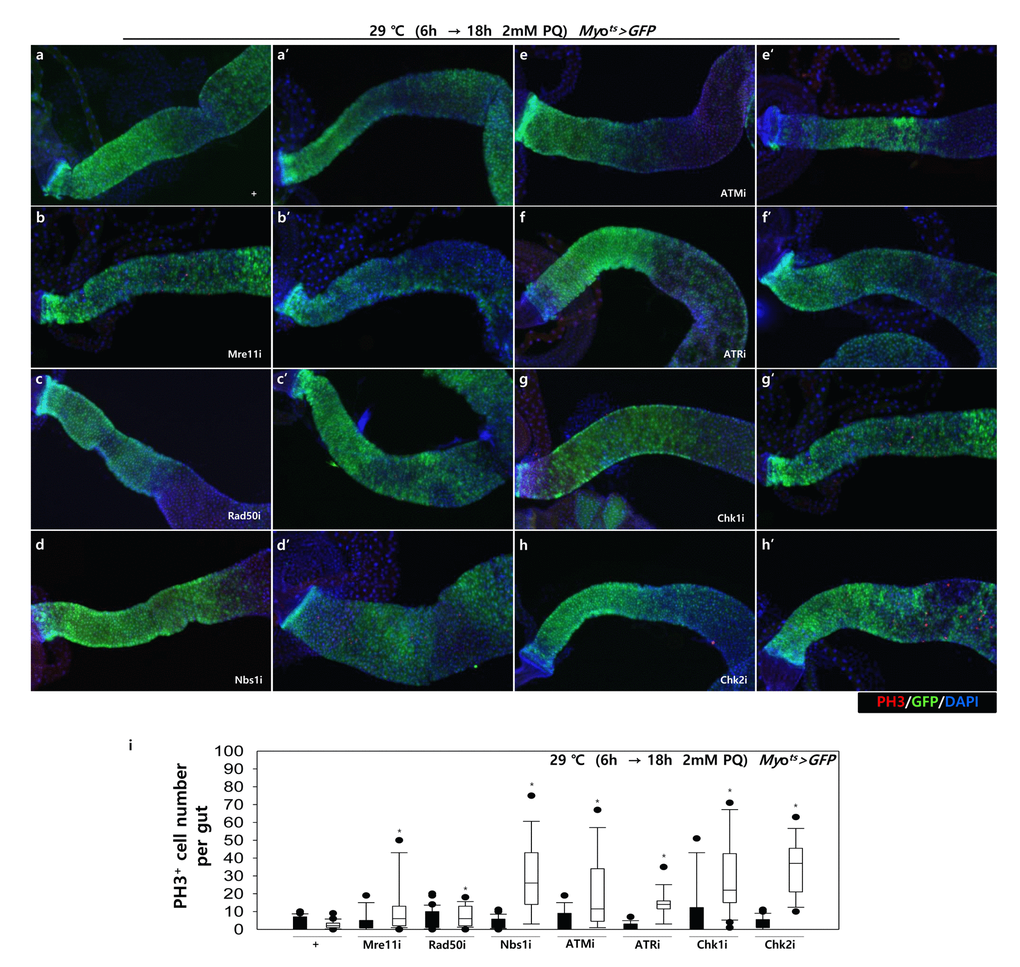 Fly stocks were maintained at 25 °C on standard food under an approximate 12 h/12 h light/dark cycle. Food consisted of 79.2% water, 1% agar, 7% cornmeal, 2% yeast, 10% sucrose, 0.3% bokinin and 0.5% propionic acid. To avoid larval overpopulation in all vials, 50–60 adult flies per vial were transferred to new food vials every 2–3 days for a period of 50–60 days or longer. Transgenic RNAi lines: UAS-Mre11-RNAi (#30476, VDRC, Vienna, Austria), UAS-Rad50-RNAi (#103394, VDRC), UAS-Nbs1-RNAi (#28215, VDRC), UAS-Nbs1-RNAi (#28216, VDRC), UAS-ATM-RNAi (#22502, VDRC); UAS-ATM-RNAi (#108074, VDRC); UAS-ATR-RNAi (#11251, VDRC); UAS-ATR-RNAi (#103624, VDRC), UAS-Chk1-RNAi (#12680, VDRC); UAS-Chk1-RNAi (#110076, VDRC), UAS-Chk2-RNAi (#110342, VDRC). Temperature-inducible differentiated EC-specific Myo1A-Gal80ts flies were obtained from B.A. Edgar [36]. Oregon-R flies were used as the wild type. Myots>GFP flies were obtained from a cross of the Oregon-R males and Myo1A-GAL4/CyO;UAS-GFP,tub-Gal80ts/TM6B (Myots) females. Myots>GFP+Mre11i, Myots>GFP+Rad50i, Myots>GFP+Nbs1i, Myots>GFP+ATMi, Myots>GFP+ATRi, Myots>GFP+Chk1i, Myots>GFP+Chk2i flies were obtained from a cross of the UAS-Mre11i/UAS-Mre11i, UAS-Rad50i/UAS-Rad50i, UAS-Nbs1i/UAS-Nbs1i, UAS-ATMi/UAS-ATMi, UAS-ATRi/UAS-ATR, UAS-Chk1i/UAS-Chk1i, UAS-Chk2i/UAS-Chk2i males and Myots females, respectively. The results described in this study were obtained using female flies.