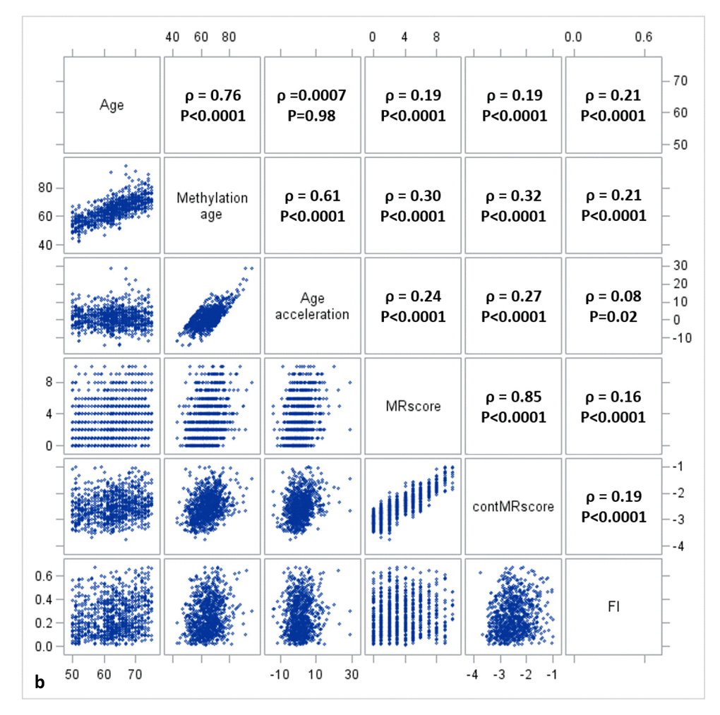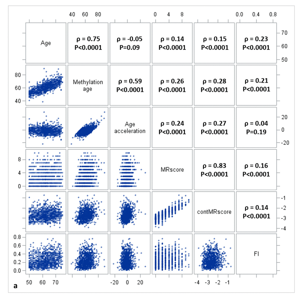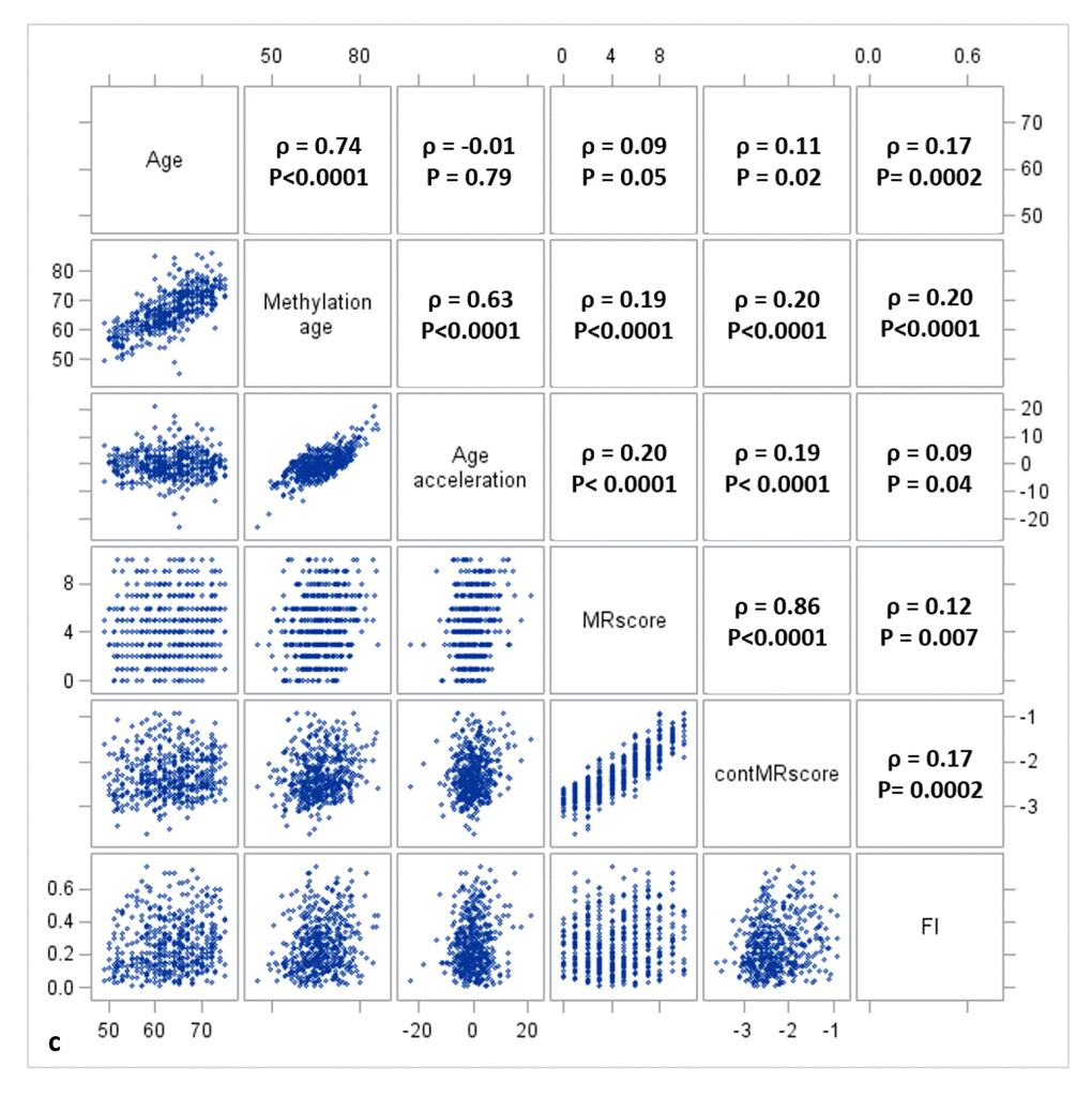 Descriptive analyses were first performed to explore the distribution and mutual correlations of chronological age, DNAm age, AA (calculated as residuals of Horvarth’s DNAm age regressed on chronological age), MRscore, and FI using histograms, scatter plots, and Spearman correlation coefficients in the three subsets of the study population separately. The mortality risk score was constructed in two forms as in the previous study [18]: MRscore was constructed according to aberrant methylation of 10 CpGs (cg01612140, cg05575921, cg06126421, cg08362785, cg10321156, cg14975410, cg19572487, cg23665802, cg24704287, cg25983901) and ranges from 0 (aberrant methylation at none of the 10 CpGs) to10 (aberrant methylation at all 10 CpGs) [aberrance was defined by the highest quartile value for the hypermethylated CpG (cg08362785) and by the lowest quartile values for the hypomethylated CpGs (other 9 CpGs) from the previous study [18]]; a continuous mortality risk score (cont.MRscore) was computed by summarizing weighted methylation β values of the 10 CpGs [cg01612140*(-0.38253) + cg05575921*(-0.92224) + cg06126421*(-1.70129) + cg08362785*(2.71749) + cg10321156*(-0.02073) + cg14975410* (-0.04156) + cg19572487*(-0.28069) + cg23665802*(-0.89440) + cg24704287*(-2.98637) + cg25983901*(-1.80325); weights were derived from the least absolute shrinkage and selection operator (LASSO) regression from the previous study [18].
