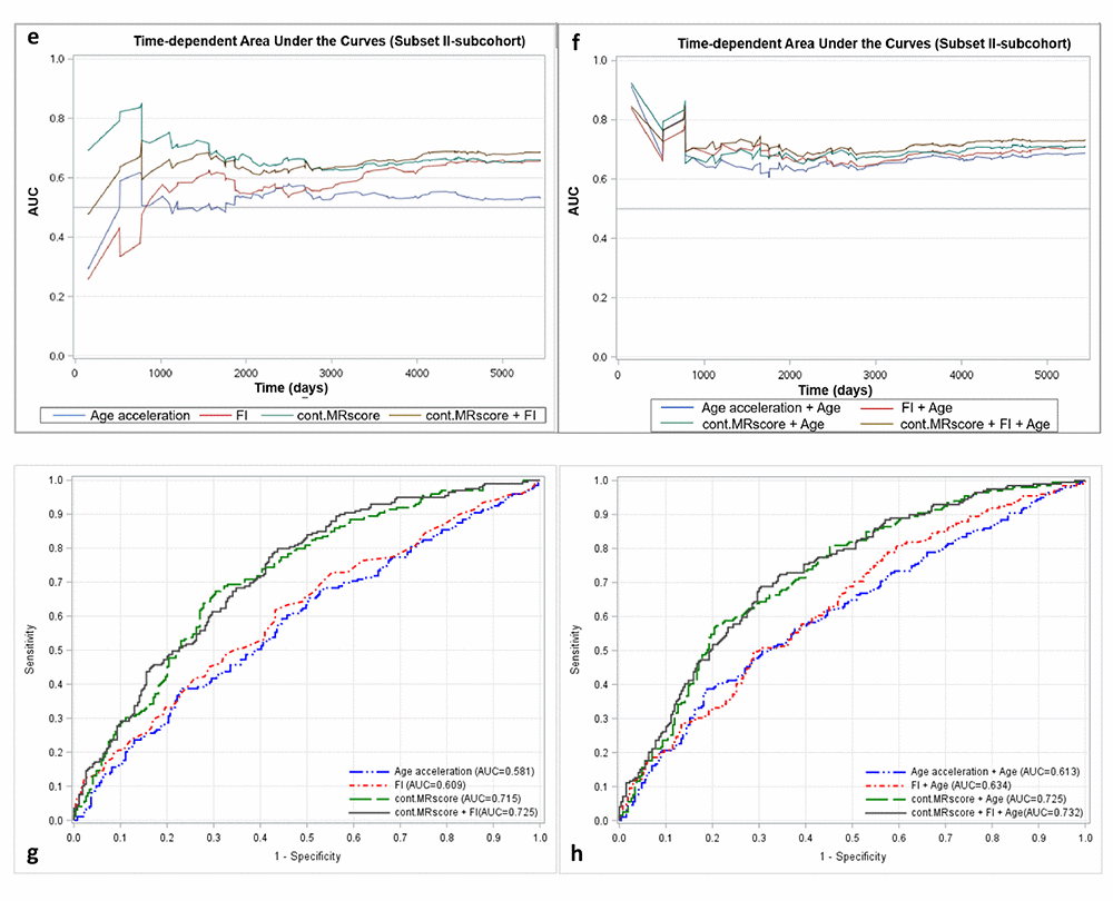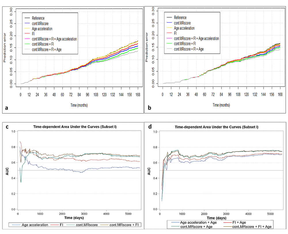 Figure 2a presents prediction error curves of these models in the analysis of subset I. From 9-year survival to 14-year survival, the prediction error calculated by FI was smaller than by AA, and larger than by MRscore. Combining FI and MRscore reduced the prediction error further, but further combination with AA did not improve the prediction accuracy (its prediction error curve overlapped with the curve for FI and MRscore combined). A similar pattern of prediction error curves was also observed in subset II (Figure 2b, curves can only be plotted in the subcohort of subset II because of the case-cohort design). Table 4 presents Harrell’s C that provides a global assessment of a fitted survival model. Cont.MRscore outperformed AA [C-statistics, 0.676 (0.644 – 0.709) versus 0.535 (0.500 – 0.570), p-value<0.0001] and FI [C-statistics, 0.676 (0.644 – 0.709) versus 0.626 (0.591 – 0.659), p-value=0.02] in subset I, and even better performance was observed when combining cont.MRscore and FI [C-statistics, 0.705 (0.673 – 0.737)], and performance improved further by adding chronological age in the model [C-statistics, 0.740 (0.709 – 0.770)]. Consistent patterns were also demonstrated when estimating time-dependent AUCs (Figure 2c and 2d). Similar results were also obtained in the subcohort samples of subset II (Table 4, Figure 2e and 2f) and in subset III (Table 4, Figure 2g and 2h).