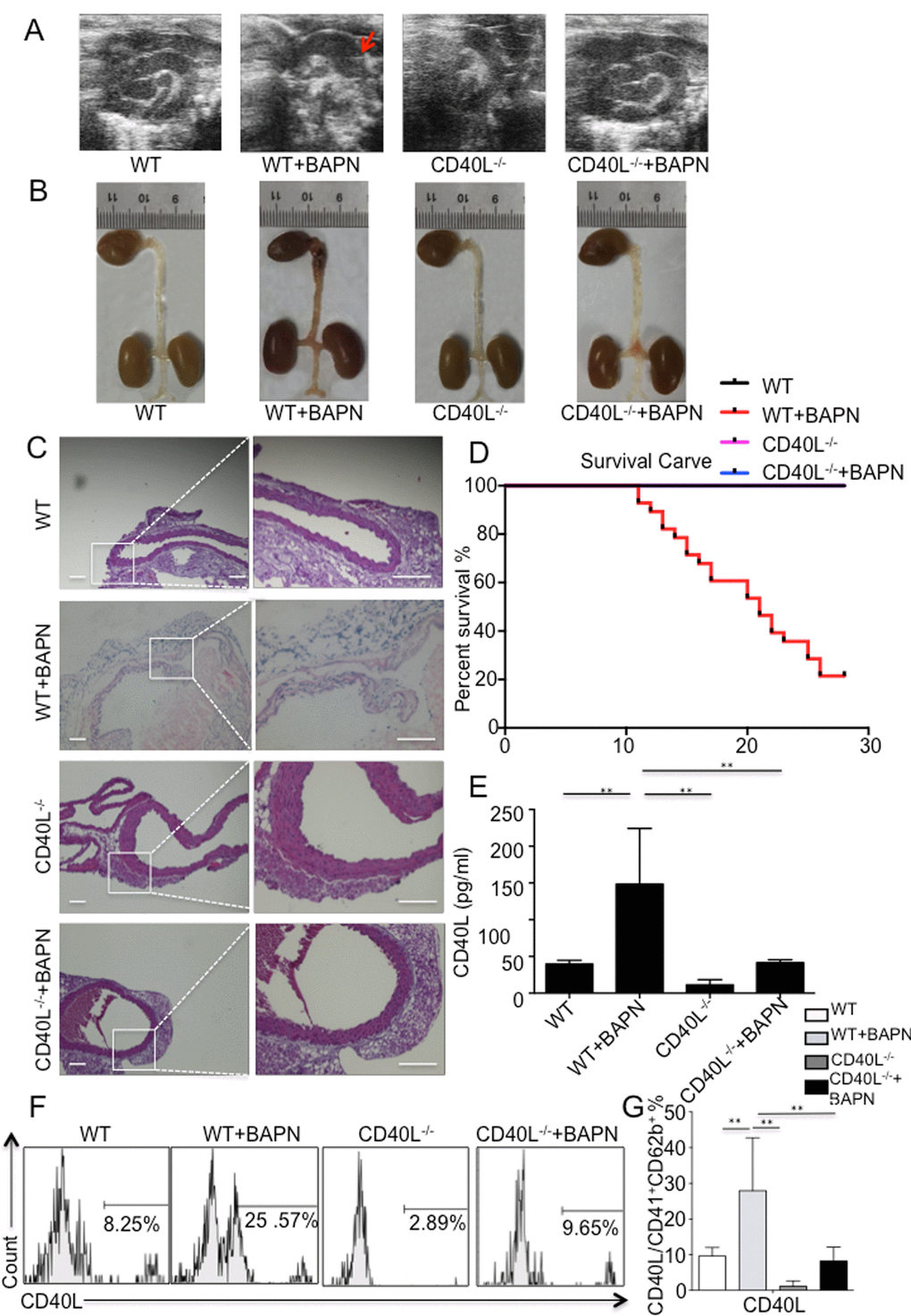 This study has a few limitations. First, except for platelets, CD40L was reported to be expressed by many other cells. The contribution of CD40L from other cells in peripheral blood need further investigation. Second, we did not perform immunohistochemical analysis on aortic specimens from AAD patients and mice, so we did not demonstrate that there is neutrophil infiltration on aortic wall after AAD formation. However, previous studies have shown that there is neutrophil infiltration in dissected aorta [3,5]. Third, we did not regularly test levels of CD40L and other factors during the 28 experimental days, which is hard for us to judge whether CD40L continuously contribute to the whole progress of the BAPN-induced development of Acute Aortic Dissection or just certain stage. Last, most experiments were performed in mice, so whether anti-CD40L therapy is a potential medical treatment target needs to be investigated by future clinical study.