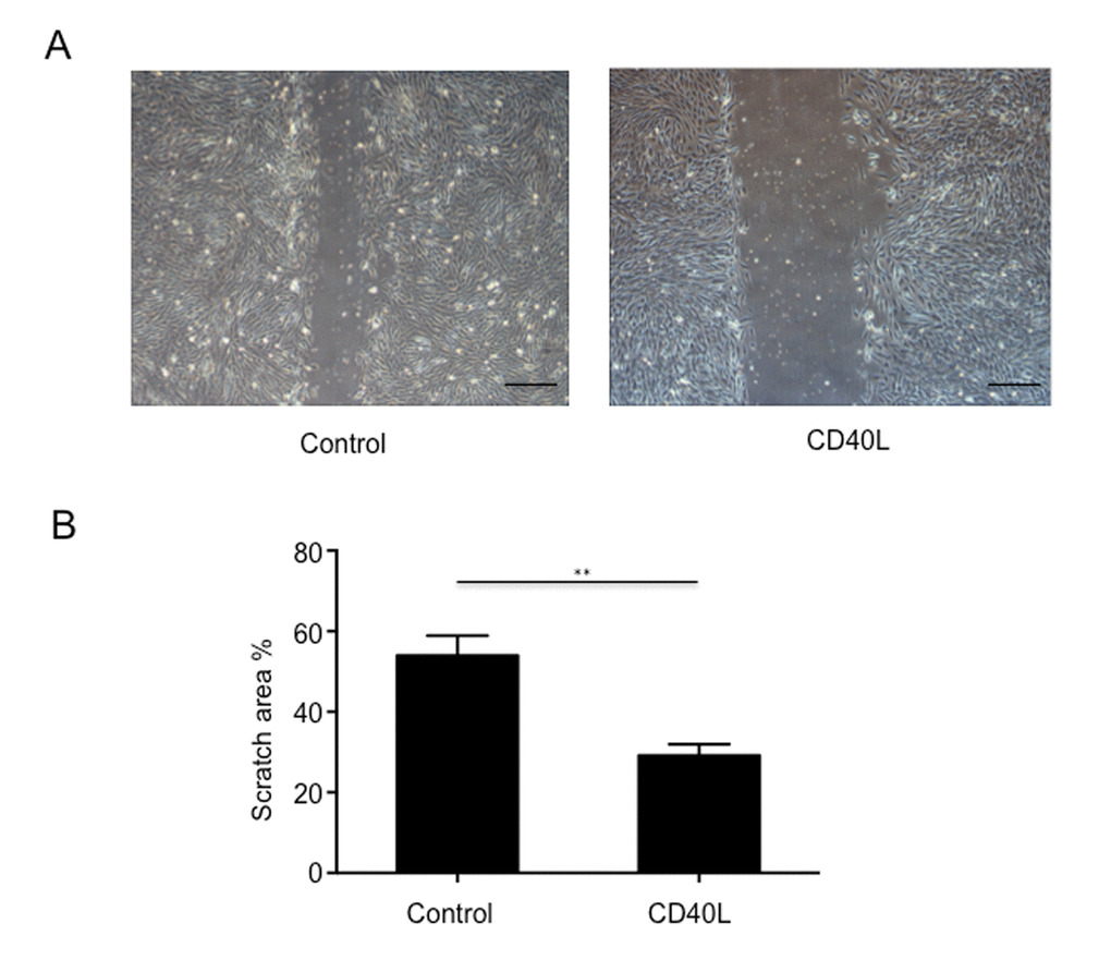 In our exploration of CD40L on endothelial cells, HUVECs were obtained and cultured with or without CD40L, and endothelial cells migration were assessed by a scratched wound assay. The results showed that scratch area was 53.97±2.846% in group 1 and 29.14±1.645% in group 2 (Fig. 3A, 3B). We could see from the image that CD40L significantly inhibited endothelial cells migration.