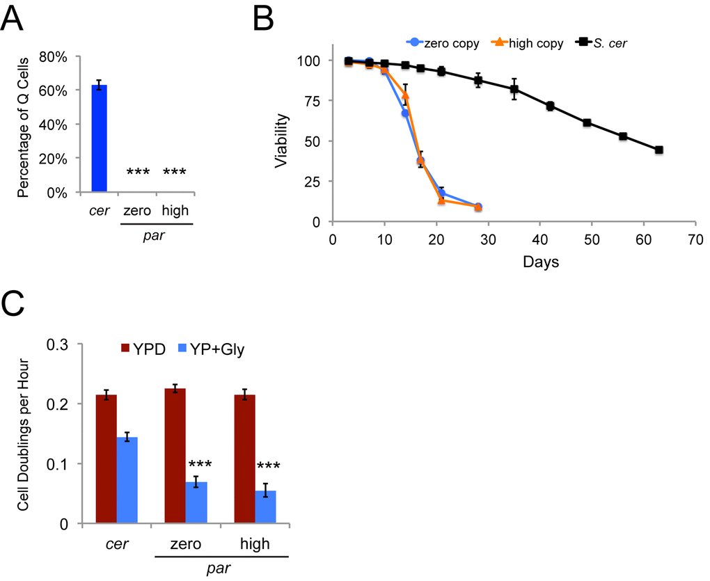 We fractionated the S. paradoxus strains with zero or varying copy numbers of Ty1 to determine whether the presence of Ty1 would alter the proportion of stationary phase cells that appropriately enter quiescence, but no Q cell fractions were obtained from the strains in this background. This is a characteristic of the strain background and not a phenotype related to Ty1, since both the original zero copy strain and the three high Ty1 copy derivatives used for the prior set of experiments failed to yield Q cell fractions (Fig. 10A). In contrast, approximately 63% of stationary phase cells were Q cells for a wild type Ty1his3AI S. cerevisiae strain (Fig. 10A). We compared the chronological lifespans of the zero and high Ty1 copy S. paradoxus strains to the wild type S. cerevisiae strain aged at 20˚C in YPD medium, since Q cells have longer lifespans than NQ cells [18]. The median chronological lifespan (days to 50% viability) was 58.7 days for the S. cerevisiae strain compared to 15.8 and 16.1 days for the zero and high Ty1 copy S. paradoxus strains, respectively (p<0.001 for zero or high Ty1 copy strains compared to S. cerevisiae strain) (Fig. 10B). Mitochondrial activity has been shown to be important for formation and function of Q cells [20,47]. We grew the wild type S. cerevisiae strain and the zero and high Ty1 copy S. paradoxus strains in rich medium containing either glucose or glycerol as a carbon source to compare their growth rates when cells could use fermentation (glucose) or had to use aerobic respiration (glycerol) to utilize the carbon source. All strains had similar growth rates in glucose containing medium (YPD), but the zero and high Ty1 copy S. paradoxus strains exhibited less than half the respiratory growth rate of the S. cerevisiae strain in glycerol medium (YP + Gly) (Fig. 10C). Growth rates were measured for the first 32 hours of growth, but the S. paradoxus strains never doubled more than 3-4 times in glycerol medium even after incubation for seven days at 20˚C. These strains are therefore defective in some aspect of respiratory growth. While it is possible that the S. paradoxus strains form Q cells that cannot be fractionated by the method we used, the shorter lifespans and defective respiratory growth are consistent with a defect in either the formation or function of Q cells.
