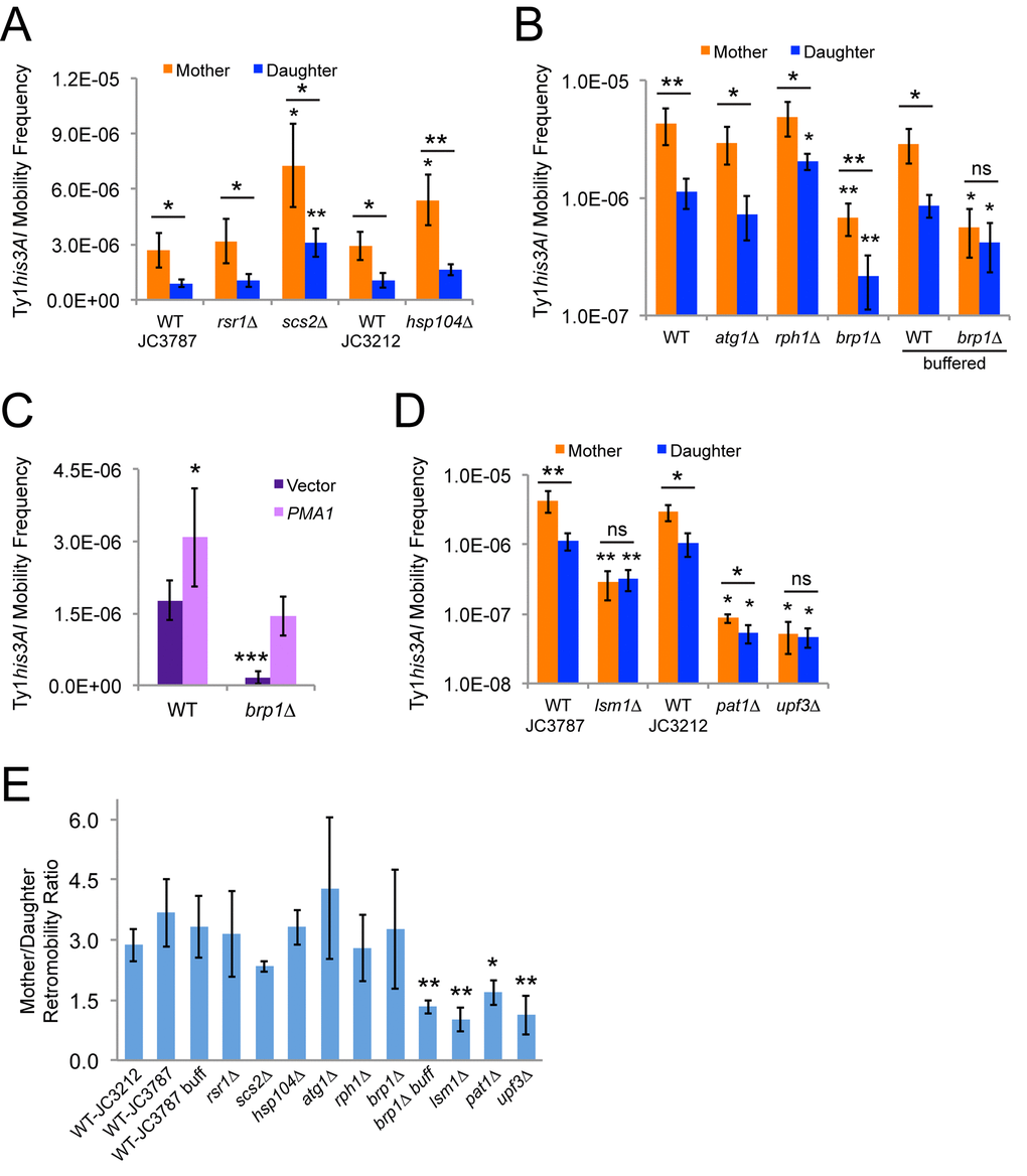 Early changes in mother cells during replicative aging include decreased vacuole acidity and increased cytoplasmic pH as a result of higher levels of the plasma membrane proton pump Pma1p in mother cells compared to daughter cells [13]. Pma1p is an essential protein, but deleting the BRP1 dubious ORF that is upstream of PMA1 reduces Pma1p protein level and activity and also reduces Ty1 retromobility [29,30]. The yeast vacuole is the site of degradation of cellular components through autophagy, and autophagy has been reported to inhibit Ty1 retromobility [14]. We found that atg1∆ mutants deficient for autophagy and rph1∆ mutants with elevated basal levels of autophagy still exhibited retromobility asymmetry between mother and daughter cells (Fig. 2B and 2E) [31,32]. There was a statistically significant increase in retromobility in rph1∆ daughter cells, but it is not clear that such a modest change is biologically significant. Retromobility asymmetry was also still observed when brp1∆ mutants defective for pH homeostasis were grown in standard rich medium (YPD), though overall Ty1 retromobility was strongly reduced and a log scale was used for the y-axis of this graph to facilitate seeing the asymmetry at these low frequencies (Fig. 2B). However, Ty1 retromobility asymmetry was no longer observed in brp1∆ mutants when cells were grown in YPD medium buffered to pH 7.1 ± 0.14 (Figs. 2B and 2E), compared to an unbuffered initial pH of 5.9 ± 0.11. Loss of asymmetry resulted from retromobility not being as strongly inhibited in the brp1∆ daughter cells with buffering, indicating that higher medium pH might compromise the ability of mutant daughter cells to maintain a low pH or another aspect of their intracellular environment that restricts Ty1. This change in pH did not significantly alter the overall level of Ty1 retromobility in these cells, though. We expressed PMA1 from its native promoter on a low-copy plasmid in wild type and brp1∆ mutant cells, which modestly increased retromobility in wild type cells and restored retromobility in brp1∆ mutants to wild type levels (Fig. 2C). These results indicate that changes in Ty1 retromobility in brp1∆ mutants result from decreased PMA1 expression, and that pH homeostasis can regulate Ty1 retromobility asymmetry between mother and daughter cells.