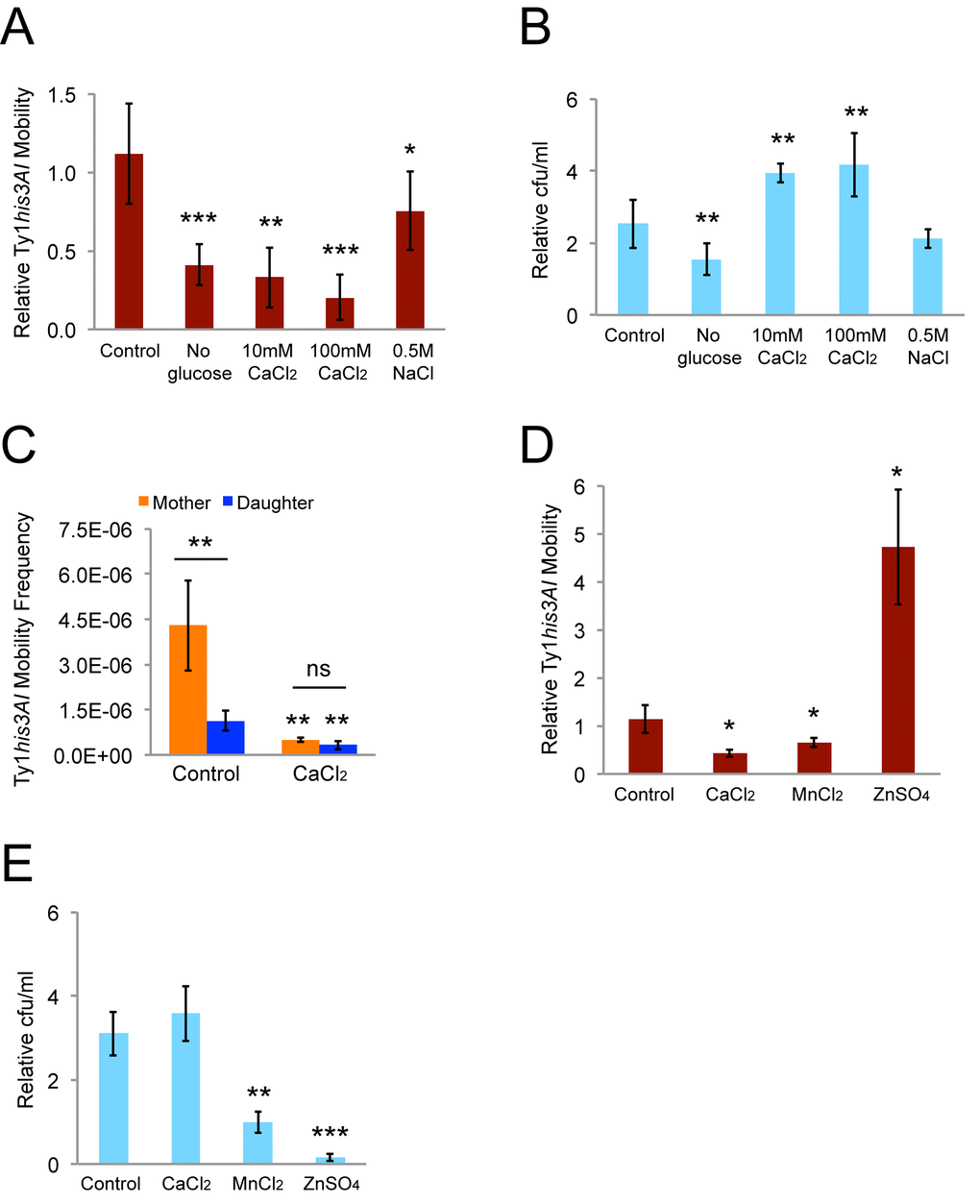 To determine whether these results are specific to calcium or whether exposure to other divalent cations would produce similar results, we tested the impact of manganese and zinc on Ty1his3AI retromobility. Manganese has previously been reported to inhibit Ty1 reverse transcriptase, and zinc inhibits the HIV retroviral reverse transcriptase [37,38]. However, our strains were unable to grow in 10 mM manganese chloride or zinc sulfate, which is the lower of the calcium concentrations we used. Therefore, we repeated the eight-hour exposure experiments with 10 mM manganese chloride or zinc sulfate and calculated relative Ty1 retromobility frequencies to test for short-term effects on retromobility. Exposure to manganese chloride decreased retromobility 1.5-fold (Fig. 3D), but there was no increase in colony-forming units/ml (cfu/mL) (Fig. 3E), indicating that growth was arrested or cells were losing viability. Exposure to zinc sulfate increased retromobility 4.7-fold (Fig. 3D), but had a toxic effect on cells, since there was a sharp decrease in cfu/mL (Fig. 3E). These results indicate that not all divalent cations have the same impact on retromobility, but toxic effects of the high concentrations of manganese and zinc complicate interpreting their specific effects on Ty1.