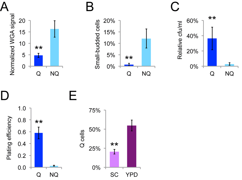 The final cell divisions as stationary phase yeast cells transition to quiescence are very asymmetric [18], giving rise to quiescent (Q) cells and nonquiescent (NQ) cells. Q cells are typically newborn daughters and young mothers and NQ cells comprise a heterogeneous subpopulation of cells that have not adapted properly for stationary phase that includes most of the older mother cells [19]. Ty1 mRNA has been reported to be in a protein-bound state in Q cells, but a protein-free state in NQ cells [20], raising the possibility that Ty1 is differentially regulated in these cells types. We fractionated NQ and Q cells by density-gradient centrifugation and verified that NQ cells were on average older, more likely to have small buds (indicating entry into S phase), more sensitive to heat stress, and the fraction of NQ cells that were able to grow into colonies when spread onto fresh solid medium (plating efficiency) was lower, as expected from previous work (Fig. 4A-D) [19]. A greater proportion of Q cells formed in YPD medium compared to synthetic complete (SC) medium (Fig. 4E), consistent with the negative impact of acetic acid accumulation on lifespan in SC medium [39].