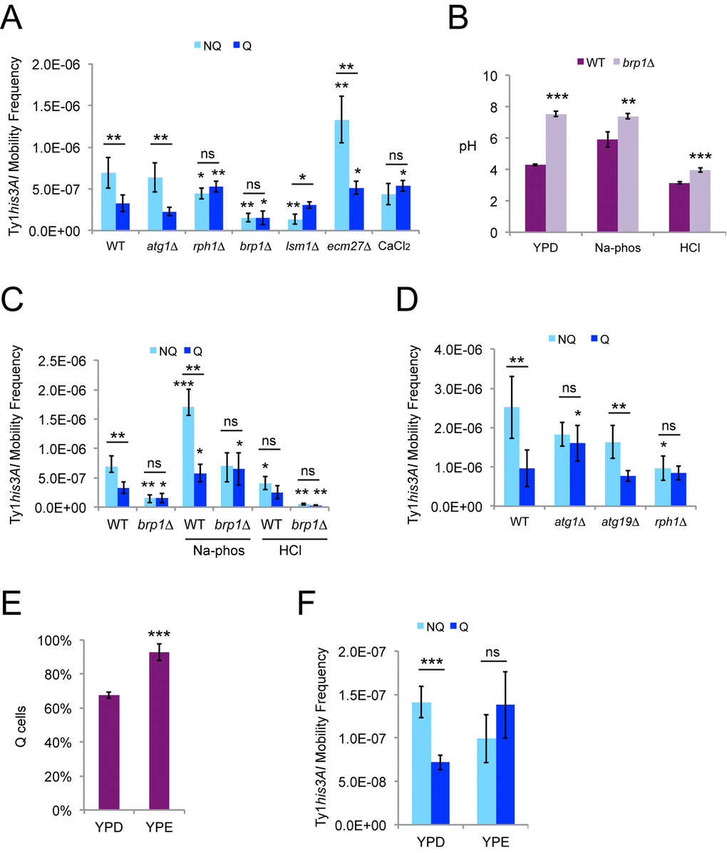 Increasing or decreasing the initial pH of YPD medium as described above increased or decreased Ty1 retromobility in the fractionated NQ and Q cells, respectively (Fig. 5C). Greater relative changes were observed in the NQ cells, which moderately increased the NQ to Q cell ratio for retromobility from 2.1 in standard YPD to 3.0 in the high pH condition and decreased the ratio to 1.6 in the low pH condition. No retromobility asymmetry was observed for brp1∆ mutants in any of the conditions, and the treatments led to greater effects on overall retromobility frequencies relative to the control condition in brp1∆ mutants (Fig. 5C), consistent with the defect in Pma1p activity compromising the ability of these cells to respond to pH changes. These data further emphasize the sensitivity of Ty1 retromobility to pH changes.
