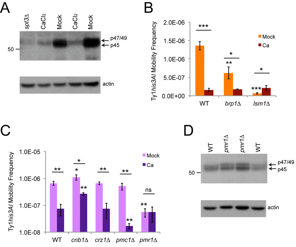 We further tested whether factors involved in calcium signaling and transport contributed to the inhibition of Ty1 by calcium. Calcineurin is a highly conserved phosphatase activated by calcium/calmodulin that regulates many proteins, including activating the yeast Crz1p transcription factor that increases expression of approximately 100 genes in response to increased calcium [44]. Two example targets of Crz1p are the Pmc1p and Pmr1p cation pumps that concentrate calcium in the vacuole, which stores most intracellular calcium in yeast, and the ER, respectively [44]. We measured Ty1 retromobility in cnb1∆ mutants lacking a non-essential regulatory subunit of calcineurin, as well as crz1∆, pmc1∆, and pmr1∆ single mutants with and without exposure to 100 mM calcium chloride. In mock-treated cells, the crz1∆ and pmc1∆ strains had wild type retromobility, while cnb1∆ strains had a very modest 1.7-fold increase in retromobility (Fig. 6C). The pmr1∆ mutants exhibited a 12-fold decrease in retromobility, consistent with a prior investigation of pmr1 mutants [37], and a log scale was used for the y-axis to more clearly show the low frequency in these mutants. Calcium had the same inhibitory effect on retromobility in crz1∆ mutants, a moderately diminished effect in cnb1∆ mutants, a stronger effect in pmc1∆ mutants, and no further effect on mobility in pmr1∆ mutants (Fig. 6C). These results indicate that the effect of calcium on Ty1 is partially dependent on calcineurin, but not Crz1p, and sensitive to the presence/absence of the Pmc1p and Pmr1p cation pumps. Previous work has shown that the absence of Pmr1p does not substantially reduce levels of Gag [37], which we confirmed in our strain background (Fig. 6D), demonstrating that the inability of calcium to further inhibit Ty1 in these mutants is not because pmr1∆ mutants already have low levels of Gag.