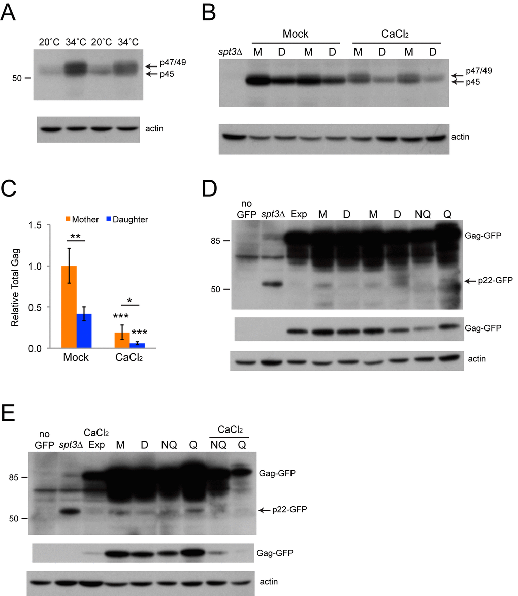Ty1 produces a dominant-negative form of Gag, p22, which inhibits retromobility at least partly by blocking proper VLP formation [12]. The antibody that we used to detect Gag does not reliably detect p22, so we utilized two congenic strains in our strain background harboring a single chromosomal Ty1 expressing a Gag-GFP fusion, with GFP fused at the processing site near the C-terminal end of Gag. This fusion was expected to result in expression of p22-GFP as well as Gag-GFP, since p22 is an N-terminally truncated form of Gag [12], allowing p22 detection using a GFP antibody. We included extracts from spt3∆ derivatives of these strains on Western blots, since spt3∆ mutants increase the level of p22 [12], as well as from a wild type strain that lacks the Gag-GFP fusion to confirm that we were able to detect p22-GFP. The p22-GFP signal was much weaker than Gag-GFP, was stronger in the spt3∆ strains, and absent from the strain lacking a GFP fusion (Figs. 7D and 7E). We did not observe any consistent reduction in p22-GFP in mother cells relative to daughter cells that could account for retromobility asymmetry. We examined extracts from NQ and Q cells with and without treatment with calcium chloride and from cells grown to exponential phase with calcium chloride treatment, but we did not observe consistent decreases in p22-GFP in NQ cells or increases in p22-GFP in the treated cells (Figs. 7D and 7E). We also found that Gag-GFP was only reduced 1.6-fold in daughters relative to mother cells (n=3, p<0.01), in contrast to the 2.4-fold decrease seen for wild type Gag, indicating that the fusion protein may not be as asymmetrically distributed. These results indicate that asymmetry in p22 expression is not likely responsible for retromobility asymmetry, provided that the GFP fusion reliably reflects wild type p22 distributions.