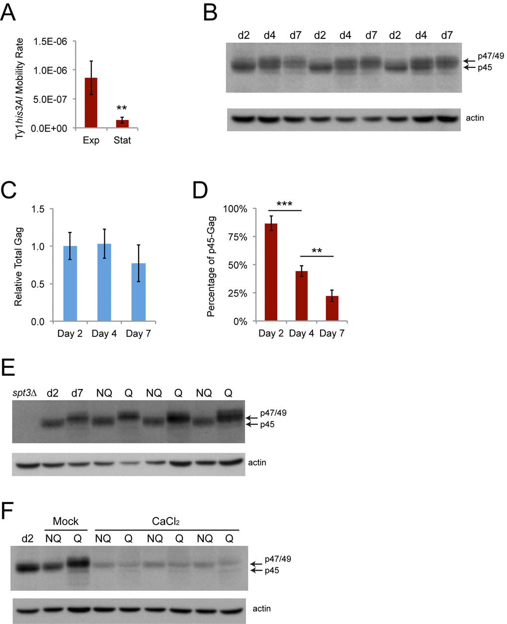 Retromobility frequencies were much lower for the experiments using stationary phase cells than for the experiments sorting mother and daughter cells, which analyzed late exponential phase cells, with a 6.2-fold decrease in the average retromobility frequency of NQ cells compared to mother cells for wild type strain JC3787 (Figs. 2 and 5). The Ty1 retromobility rate per cell generation measured through fluctuation tests was 6.5-fold lower in cells grown to early stationary phase (four days at 20˚C) compared to mid-exponential phase (two days at 20˚C) (Fig. 8A). Total Gag levels were equivalent at mid-exponential phase (day two) and early stationary phase (day four), and were modestly but not significantly lower at the point at which we fractionated NQ and Q cells (day seven) (Figs. 8B and 8C). More strikingly, there was a steady decrease in the proportion of p45-Gag over this time course (Figs. 8B and 8D). We then found that virtually all the Gag signal in NQ cells is from p45, while virtually all the Gag signal for Q cells is from p47/49 (Fig. 8E). There was no substantial difference in the total amount of Gag between the NQ and Q cells, though. Treatment with calcium chloride substantially reduced total Gag in NQ and Q cells, as expected, but also resulted in p47/49-Gag being the major form of Gag in NQ cells (Fig. 8F). Accumulation of immature and inactive forms of Gag during stationary phase and in Q cells could account for the reduction in overall mobility and contribute to NQ-Q cell retromobility asymmetry.