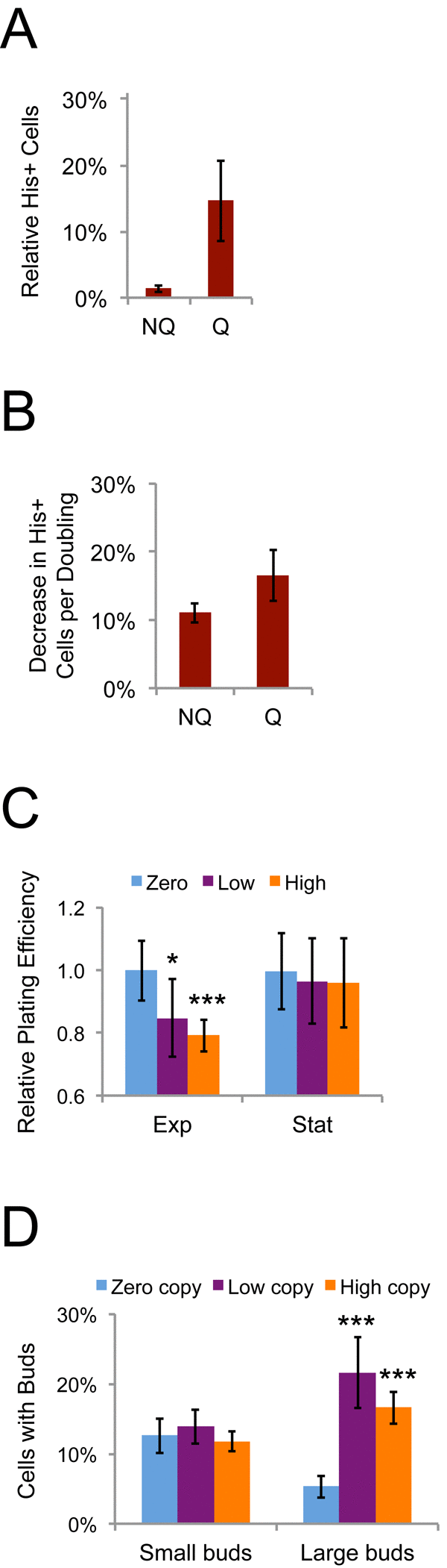 Cells were inoculated at a density of 5,000 cells/mL in 20 mL of liquid medium in 125 mL flasks and grown for seven to eight days at 20˚C, at which point quiescent and nonquiescent cells were separated using Percoll density centrifugation, as previously described [19]. Fractionated cells were diluted in five mL of water, centrifuged, washed twice with one mL of water, and suspended in one mL water. Thermotolerance was determined by incubating cells in water at 52˚C for 20 minutes, spreading dilutions of cells on YPD agar to determine colony-forming-units (cfu)/mL, and dividing those values by the cfu/mL of untreated cells to determine the percentage of thermotolerant cells. Cell budding was determined by light microscopy and counting the fraction of cells with buds that were equal to or less than 50% of the size of the mother cell (small-budded cells) or with buds greater than 50% of the size of the mother cell (large-budded cells). Unfractionated cells from S. paradoxus strains with different Ty1 copy numbers grown for seven days at 20˚C in YPD were diluted 100-fold into 20 mM EDTA and incubated for five minutes with continuous vortexing to disrupt clumped cells prior to determining the number of budded cells. Relative replicative age was determined as for mother and daughter cell sorting. Plating efficiencies were determined by using light microscopy to count cells, spreading known numbers of cells on solid rich medium, and incubating the cells for four days at 30˚C to allow colonies to form. The number of colonies that formed was divided by the total number of cells spread on the medium to calculate the plating efficiency.
