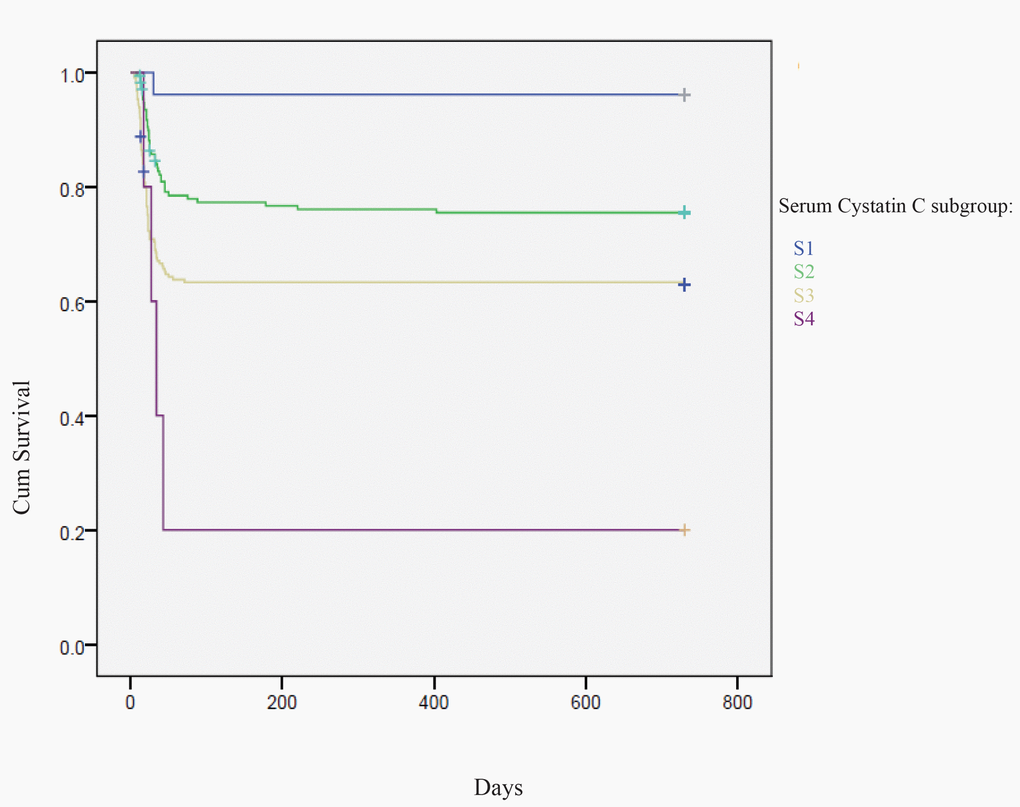 Other studies have evaluated the usefulness of CysC as a marker of cardiovascular damage or increased risk of onset of cardiovascular disease in the general population [19, 20]. Our study shows that increased levels of sCysC may be considered as predictor of long-term cardiovascular mortality in adult cardiac-surgery patients. In fact, our results obtained evidenced that the cumulative probability of death for cardiovascular causes was significantly higher in patients with enhanced values of sCysC compared to lower levels (observed survival: S4 = 20% vs. S1 = 96.2%). Kaplan-Meier analysis therefore highlighted an overlap between these two markers of kidney function (sCysC and sCrea) (Figures 1 and 2) about the prognostic utility of cardiovascular mortality.