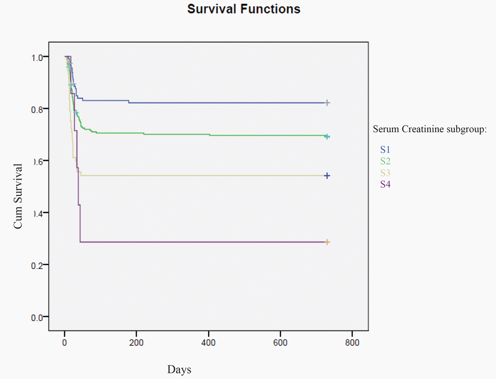 In contrast to what we observed for normal values of sCysC, the Figure 2 shows how even for values of serum creatinine less than 0.81 mg/dl, the probability of survival decreases to 82.6%.