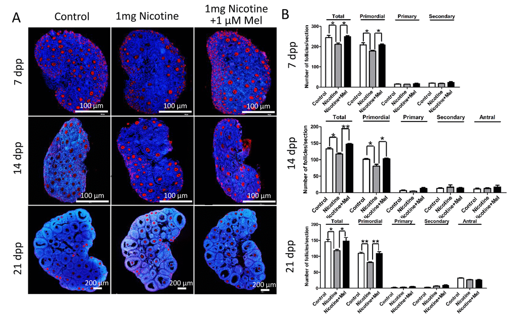 Strikingly, we found that administration of melatonin, in the range of 0.25-1 μM, after treated with 1 mg /kg nicotine, prevented almost completely the effects of this latter on the pup’s ovaries (Figs. 2B and 2E). Expectedly, melatonin significantly increased the proportion of oocyte in follicles in nicotine-exposed ovaries to the control comparable level, especially in the 1 μM melatonin group (Fig. 2E). However, changes between different nicotine concentrate treated groups in the total oocyte number were not statistically significant (Fig. 2F). Thus 1 μM concentrate administration of melatonin was used in the subsequent in vivo study. In addition, melatonin preserved the follicle population at control level up to 21 dpp (Figs. 3A and 3B). In this regard, we observed that after melatonin treatment at 7 dpp, 14 dpp and 21 dpp, no significant difference about total follicle number and PF remained between the control and melatonin treatment mice, but even after 21 dpp there were also remain significantly different in total follicle number (118 ± 6 vs146 ± 14 for control group in Fig. 3B) and PF (81 ± 4 vs 109 ± 8 for control group in Fig. 3B) between the nicotine exposed and control mice (Figs. 3A and 3B). These results verified that the ovaries of pups which melatonin treatment after nicotine-exposed were able to recover a normal primordial follicle pool.