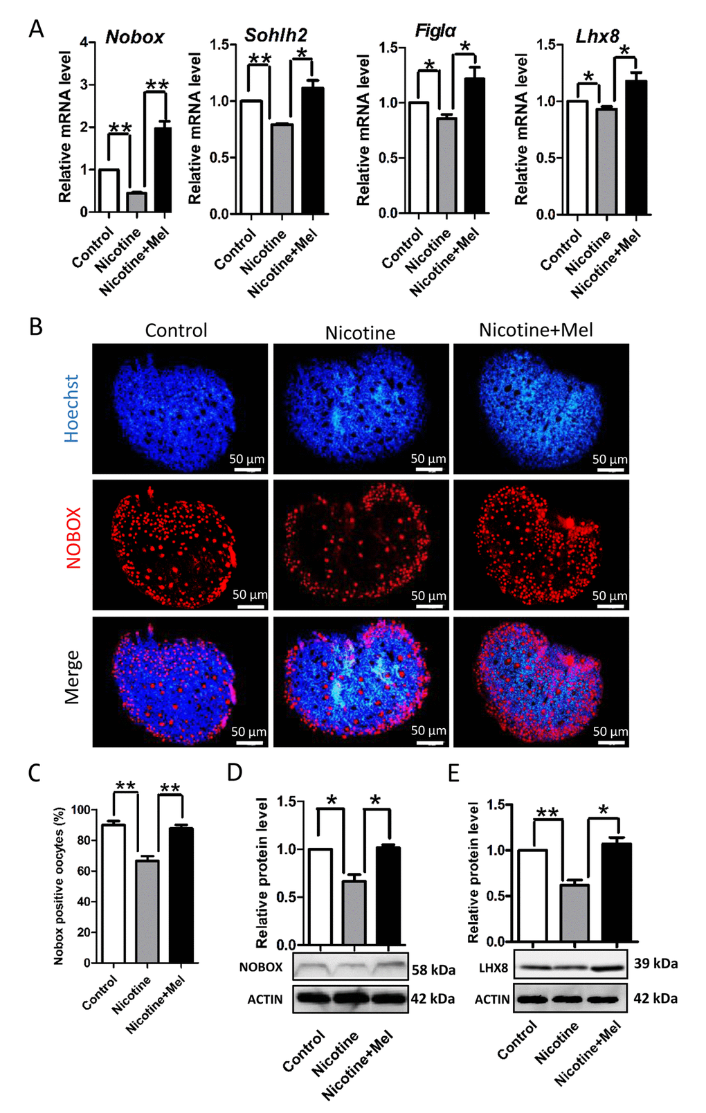 In order to clarify the mechanisms through which nicotine or melatonin may affect the formation of primordial follicles, In subsequent series of experiments, we found that nicotine affected the expression of oocyte genes, such as factor in the germline alpha (Figla) [48], newborn ovary homeobox (Nobox) [49], spermatogenesis and oogenesis helix-loop-helix 2 (Sohlh2) [50,51] and LIM homeobox 8 (Lhx8) [52,53], and ovarian somatic cell proliferation which are known to be crucial for PF assembly [6,46,47]. Actually, nicotine injection caused a significant decrease in the ovarian expression of oocyte specific genes such as Figla, Nobox, Sohlh2 and Lhx8 at mRNA levels (Fig. 5A) and for NOBOX and LHX8 also at protein level (Figs. 5B-5E). Noteworthy, melatonin injection prevented such decrease (Figs. 5A-5E).