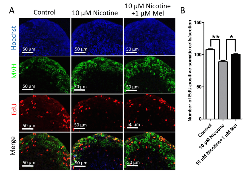 0 dpp ovaries were collected and cultured as described previously [64]. Briefly, ovaries were collected and cultured on Millicell-PC membrane inserts (Millipore, PIHA01250, Medford, MA, USA) with medium filling only the lower chamber for 5 days (equal to 4 dpp); the medium was removed from the lower chamber until only a thin film covered the ovaries. The culture medium was Dulbecco’s Modified Eagle’s Medium (DMEM)/F12 (Hyclone, SH30023.01B, Beijing, China) and α-Minimum Essential Medium (α-MEM; Hyclone, SH30265.01) (1:1) supplemented with 10% fetal bovine serum (FBS; Gibco, 10099-141, USA), 50 μg/ml insulin-transferrin-selenium A mix (ITA, Gibco, 41400-045), 100 U/mL penicillin G, 100 mg/ml streptomycin sulfate, 110 μg/ml sodium pyruvate. Ovaries were treated with nicotine (5 μM - 500 μM) and nicotine plus melatonin (0.5 μM - 5 μM) as indicated. Nicotine doses were selected according to previous in vitro experiment performed by Sudheer et al. [55] and Kim et al. [65]. The medium was equilibrated for 2 h prior to use in a 37 °C incubator with 5% CO2, and changed every 48 h with replacement of half the complete medium with fresh medium. At the end of this culture period, the ovarian tissues were collected only for analyzing EdU proliferation assay in this paper.