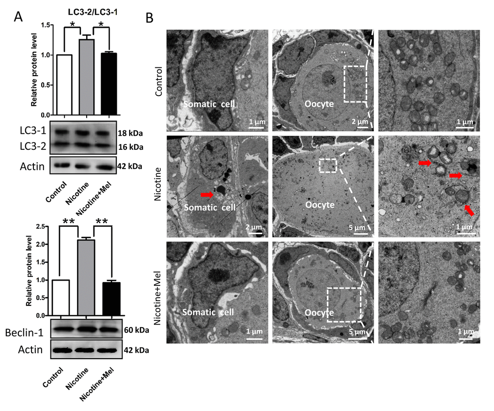 We found that nicotine injection increased the level of ROS in the pup ovary (Figs. 7A-7B), elevating, at the same time, the transcript level of anti-oxidative enzymes such as Girx2, Gpx1 and Sod1 (Fig. 7C). Moreover, up-regulation of expression of AMP-activated protein kinase α-1 (AMPKα-1), a master regulation of the cell energy homeostasis and downregulation of AKT, mTOR and BCL-2 proteins (Fig. 7D), two events usually associated to autophagy (for a review, see Alers et al., 2012) [57], suggested activation of this process in the ovaries of the nicotine exposed pups. This was also supported by the increased ratio of the amount of the autophagosome membrane-associated light chain 3-II (LC3-II) and the cytosolic LC3-I proteins and up-regulation of BECLIN1 protein, two other autophagy markers, in the nicotine exposed ovaries (Fig. 8A). At the same time, TEM observations showed the presence of autophagosomes much more often in the cytoplasm of oocytes of ovaries of pups exposed to nicotine than unexposed and melatonin treated (Fig. 8B). Thus, the injection of nicotine plus melatonin in the pups appeared to significantly decrease both ROS increase and autophagy marker’s expression induced by the drug. On the other hand, we found that nicotine did not increased the number of apoptotic cells in the ovaries, there were rare cells found to be positive for apoptotic markers in the control group and experimental groups (The percentage of apoptotic cells/sections: control = 4.5 ± 0.9%; nicotine = 6.1 ± 1.62%; nicotine + melatonin = 4.2 ± 1.5%) (TUNEL staining Figs. S1D and S1E). Similar results could be found in previous publications about smoke-exposed ovaries [16].