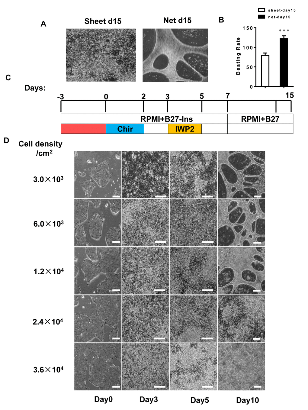 To generate CMs from pluripotent stem cells, we applied a small molecule-based differentiation method. Upon differentiation, we observed three typical forms of CM clusters: 1) isolated beating clusters at a lower efficiency and 2) net-shaped and 3) sheet-shaped CMs at higher efficiencies. When the efficiency/purity was greater than 90%, the derived CMs predominantly exhibited the latter forms. Spontaneous contraction could be observed from 7 days after induction, and the different shapes of CM clusters became distinguishable. The net-shaped cardiac cells beat vigorously, with a beating rate of up to 122 beats per min, and the sheet-shaped cardiac cells beat mildly at a lower rate of 80 beats per min (Figure 1A, B, Movie S1 and Movie S2).